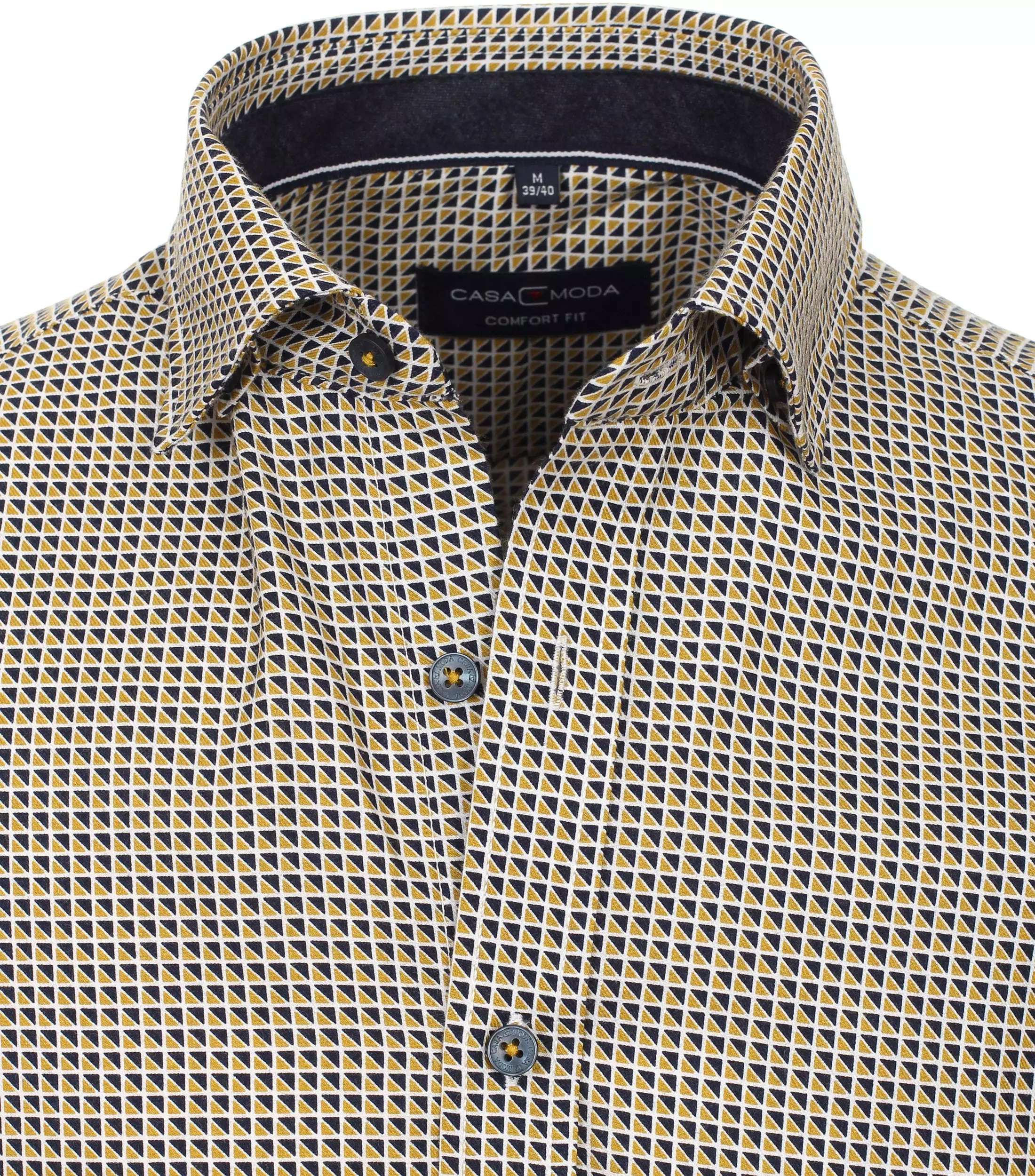 Casa Moda overhemd lange mouw zonder borstzakje in okergeel, zwart en wit fantasie patroon. Kraag met under button down. Binnenkant kraag en manchetten zijn met een contrasterend stofje afgewerkt. Model comfort fit in 100%katoen.