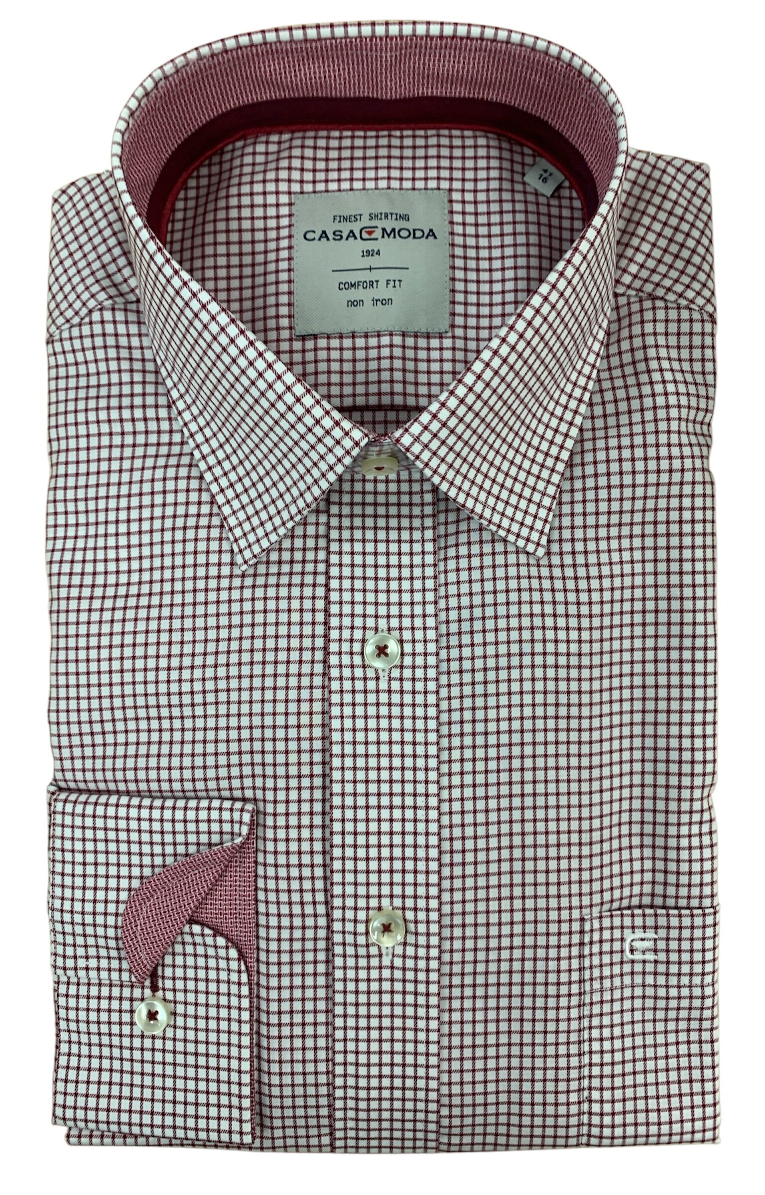 Casa Moda overhemd lange mouw met borstzakje in een rood en wit ruitje. Model comfort fit in 100% katoen strijkvrij.