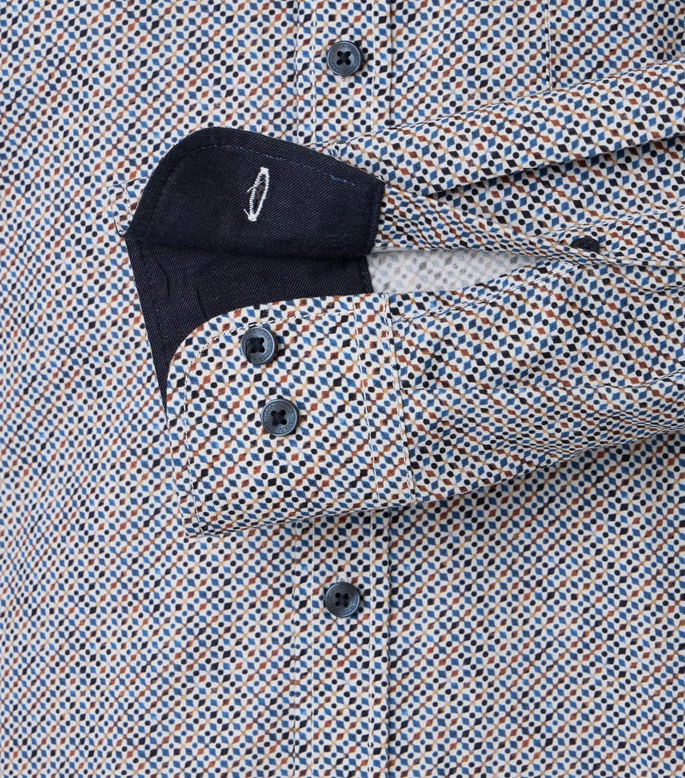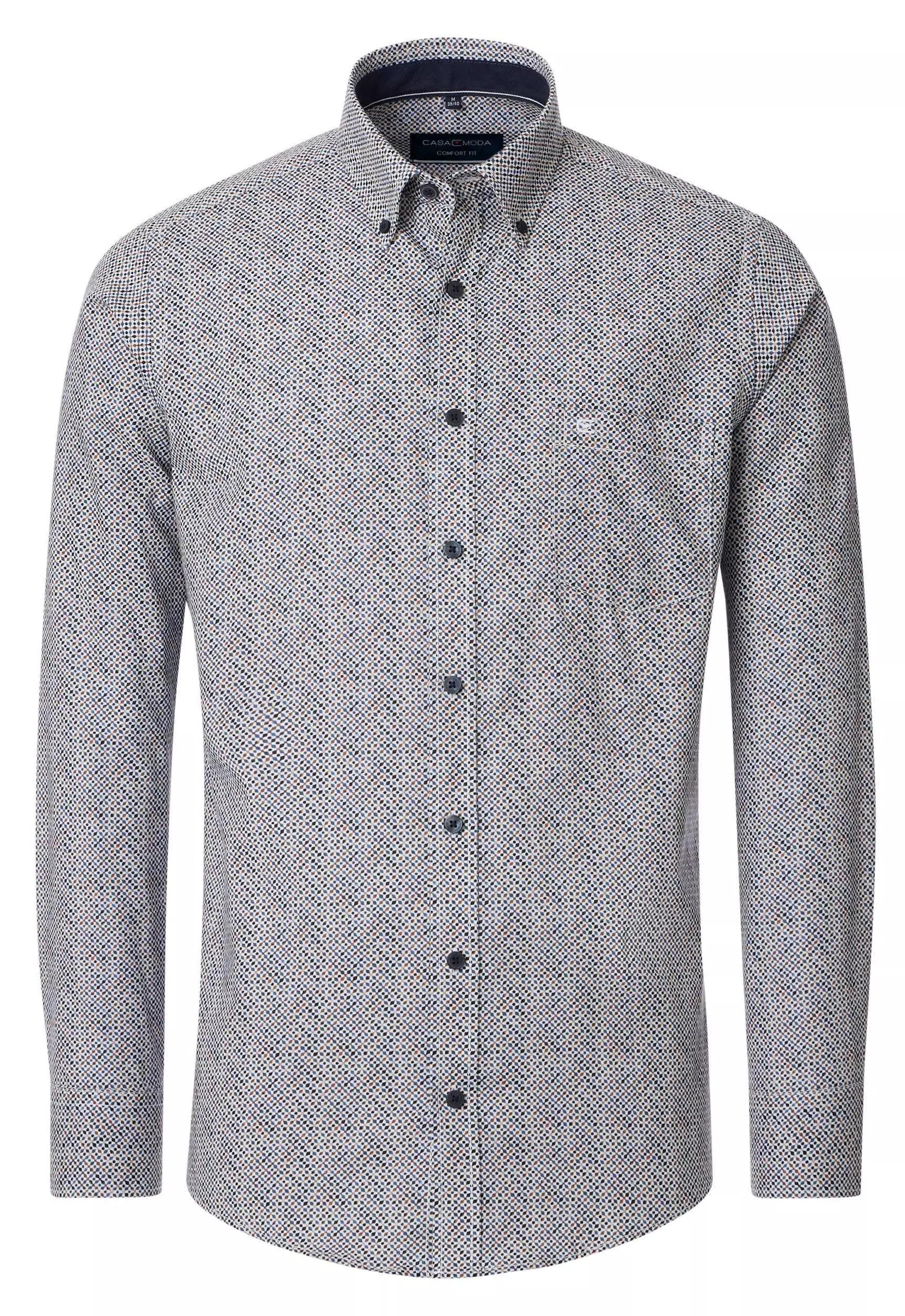 Casa Moda overhemd lange mouw met borstzakje en kraag button down in wit met blauw en camel fantasie design. Model comfort fit in 100%katoen easy care.