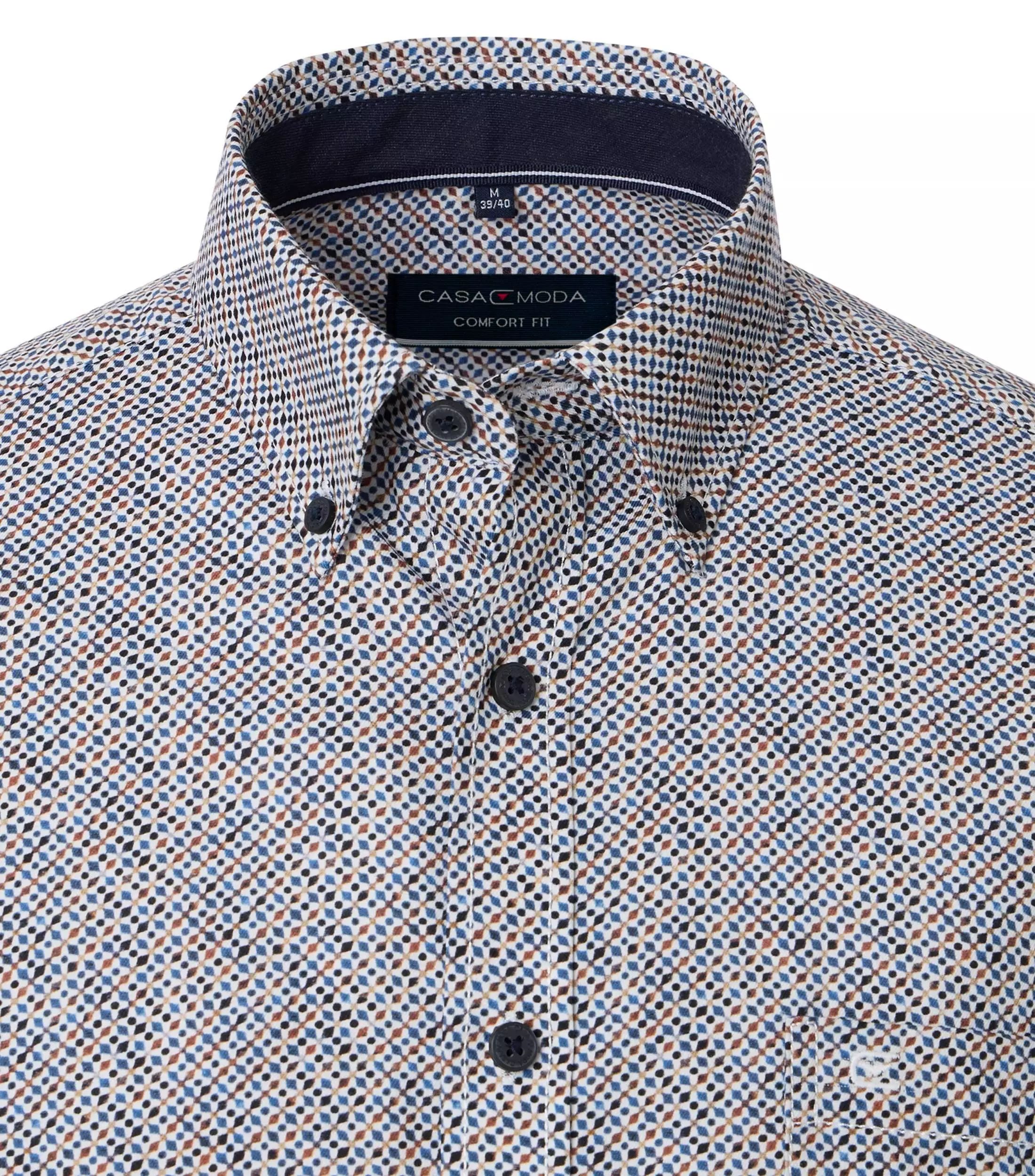 Casa Moda overhemd lange mouw met borstzakje en kraag button down in wit met blauw en camel fantasie design. Model comfort fit in 100%katoen easy care.