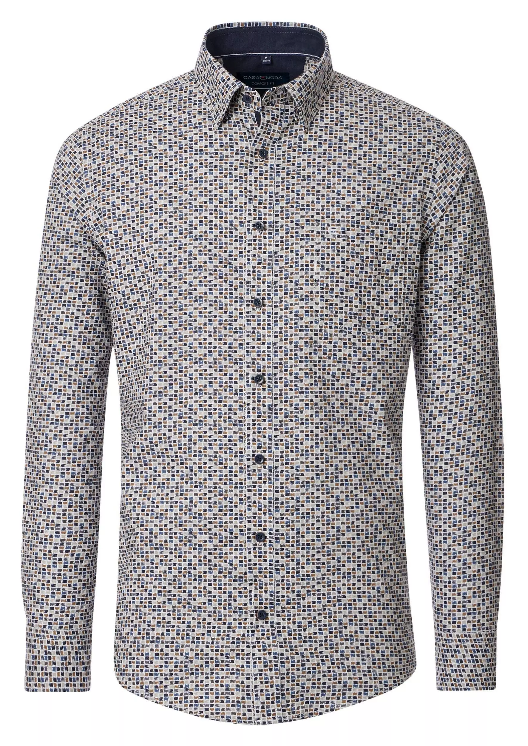 Casa Moda overhemd lange mouw met borstzakje en kraag under button down in wit met blauw, beige en camel fantasie design. Model comfort fit in 100% katoen easy care.