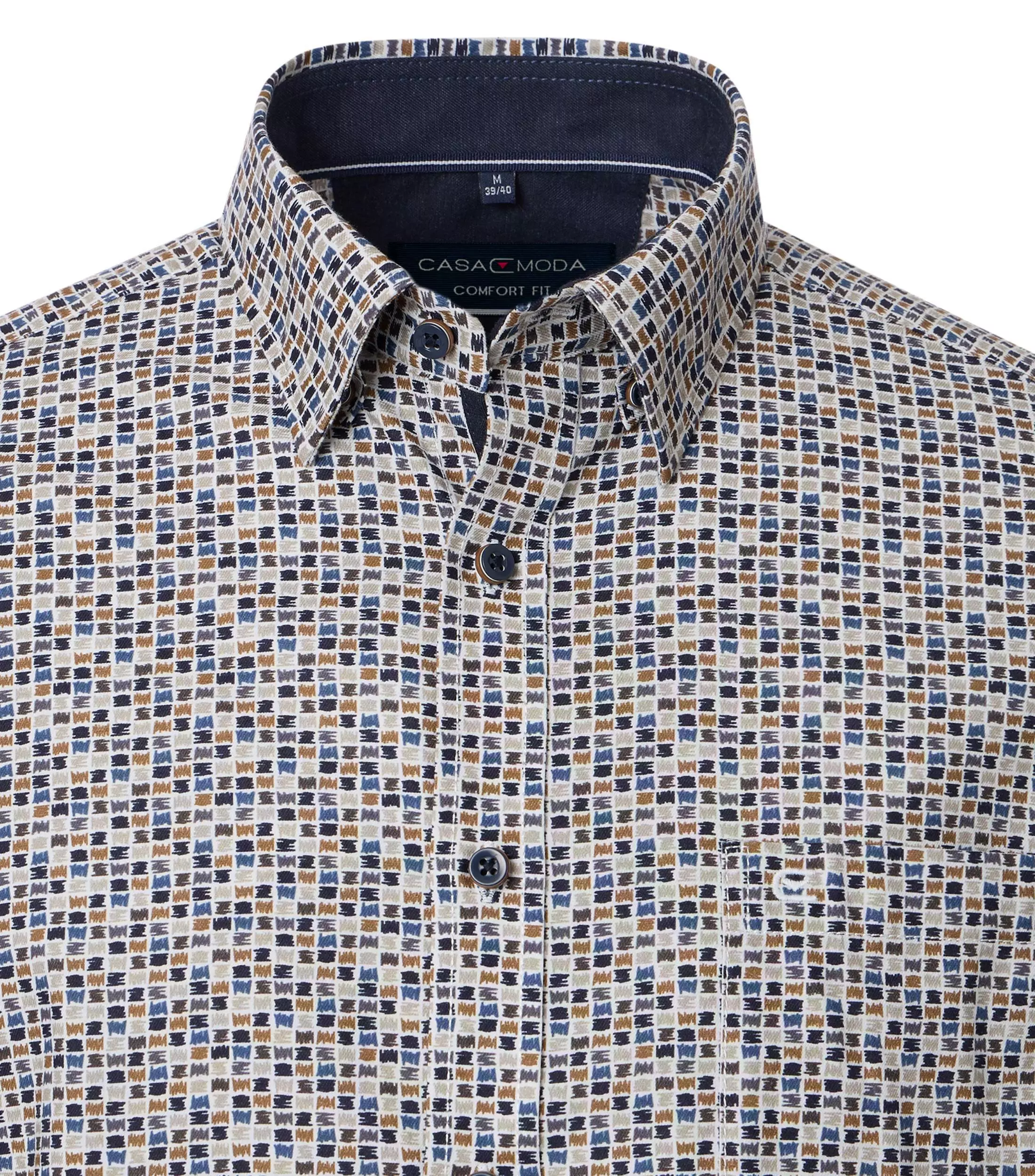 Casa Moda overhemd lange mouw met borstzakje en kraag under button down in wit met blauw, beige en camel fantasie design. Model comfort fit in 100% katoen easy care.