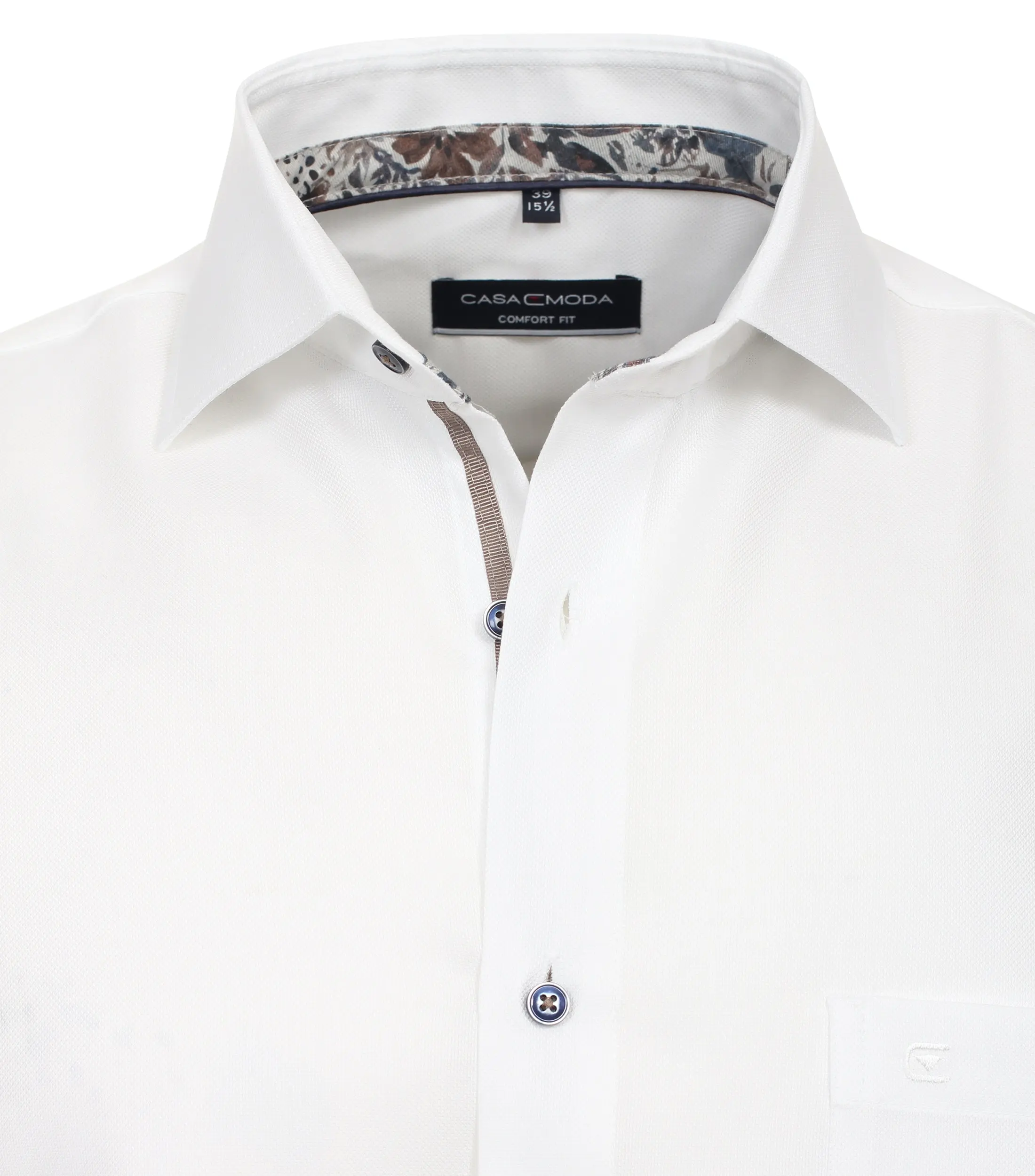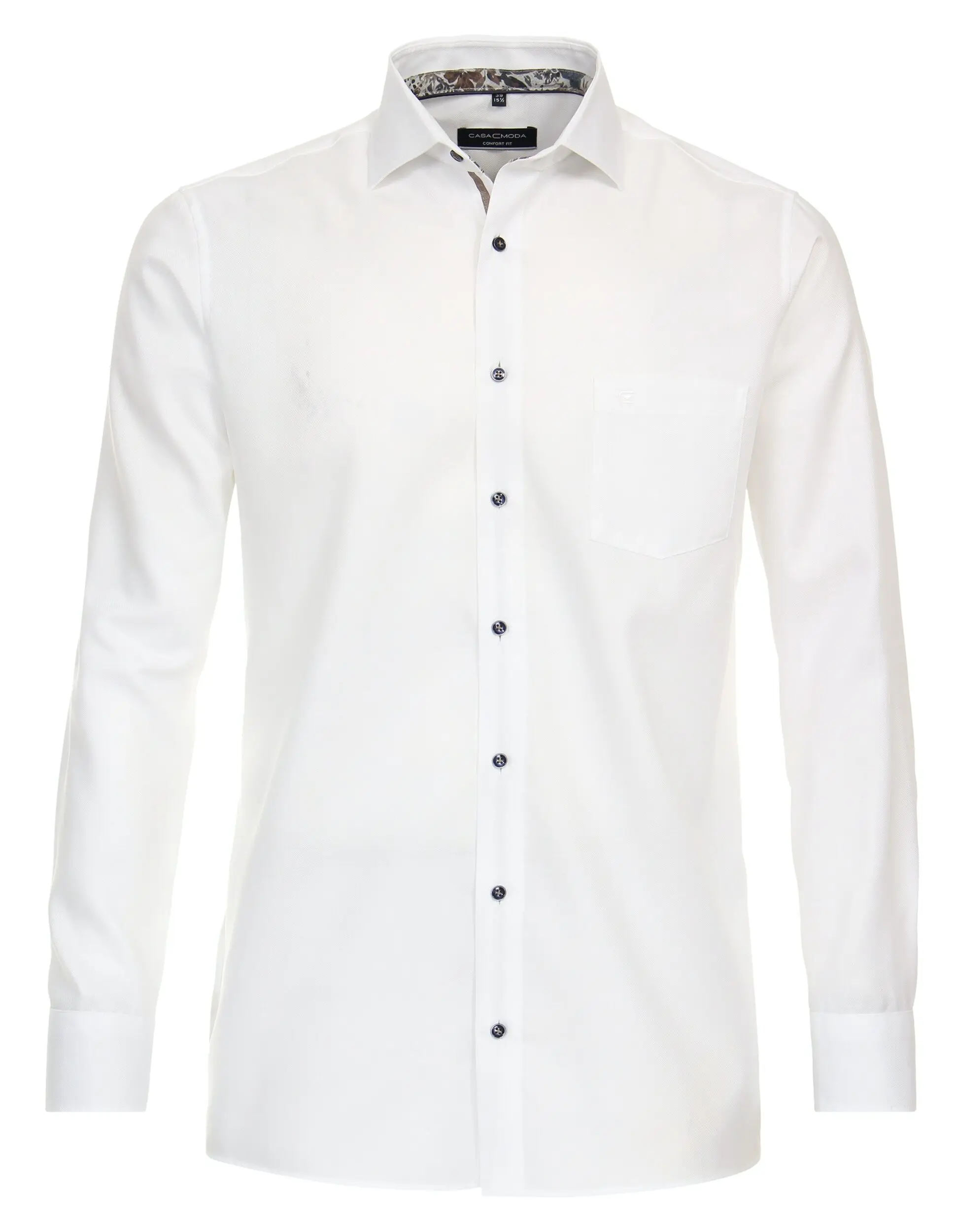 Casa Moda overhemd lange mouw met borstzakje wit met ingeweven structuurtje. Binnenkant kraag en manchetten zijn afgewerkt met een contrasterend stofje. Model comfort fit in 100% katoen strijkvrij.