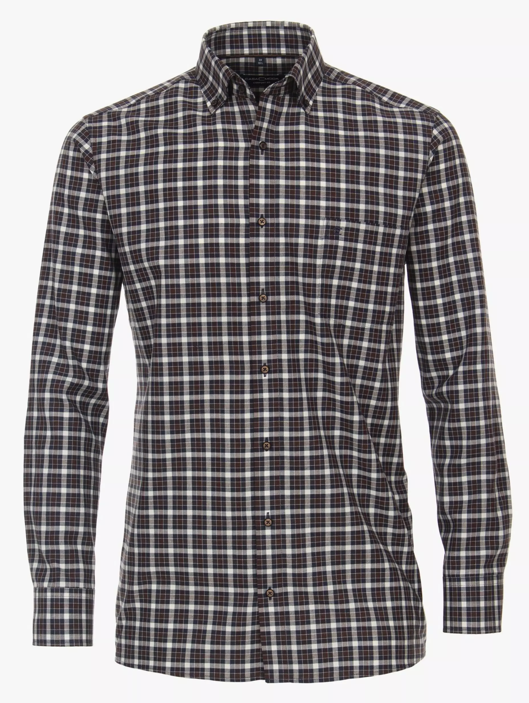 Casa Moda overhemd lange mouw met borstzakje in wit, donkerblauw en bruin ruitje met kraag button down. Model comfort fit in 100%katoen dunne flanel easy care.
