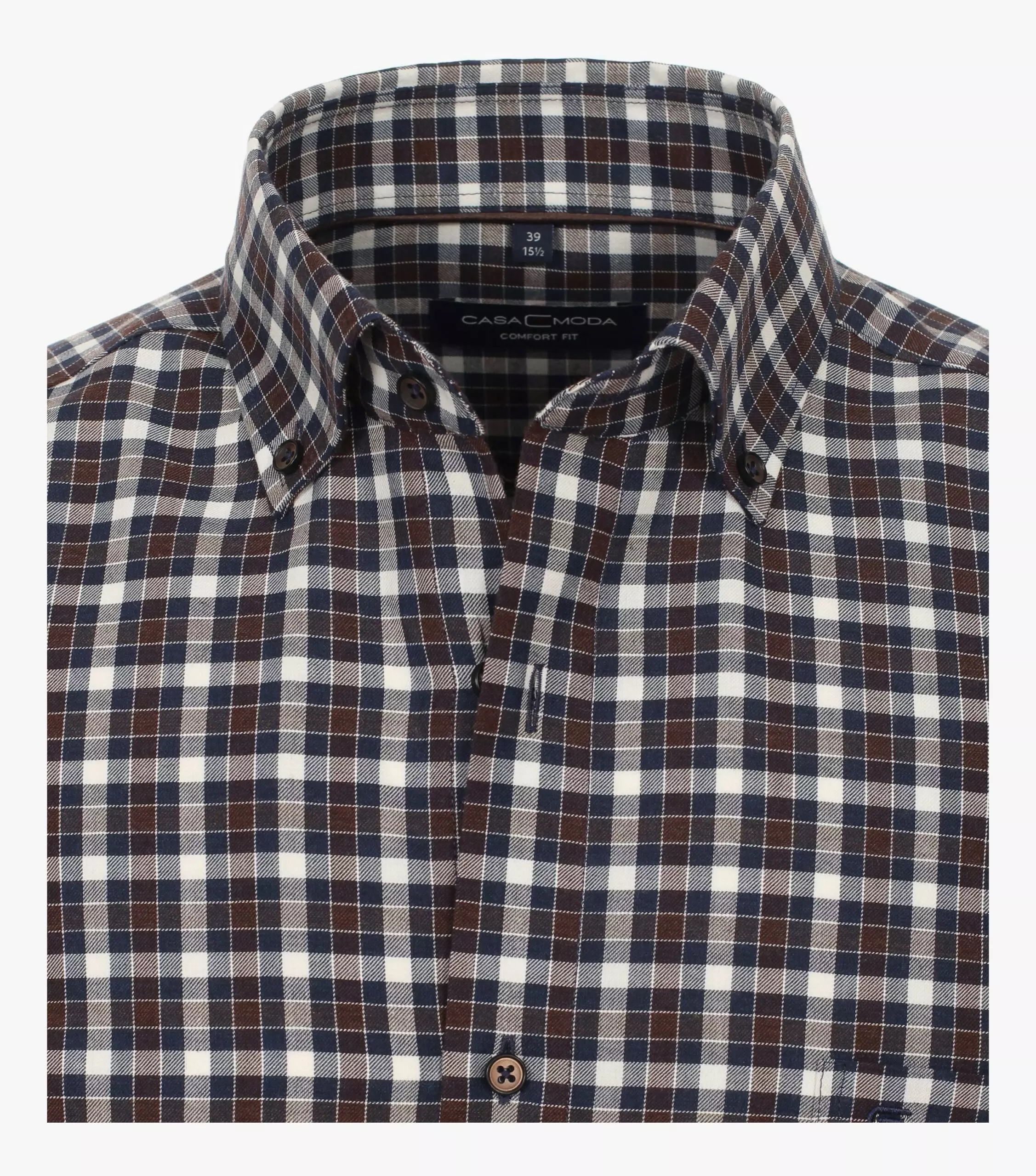 Casa Moda overhemd lange mouw met borstzakje in wit, donkerblauw en bruin ruitje met kraag button down. Model comfort fit in 100%katoen dunne flanel easy care.