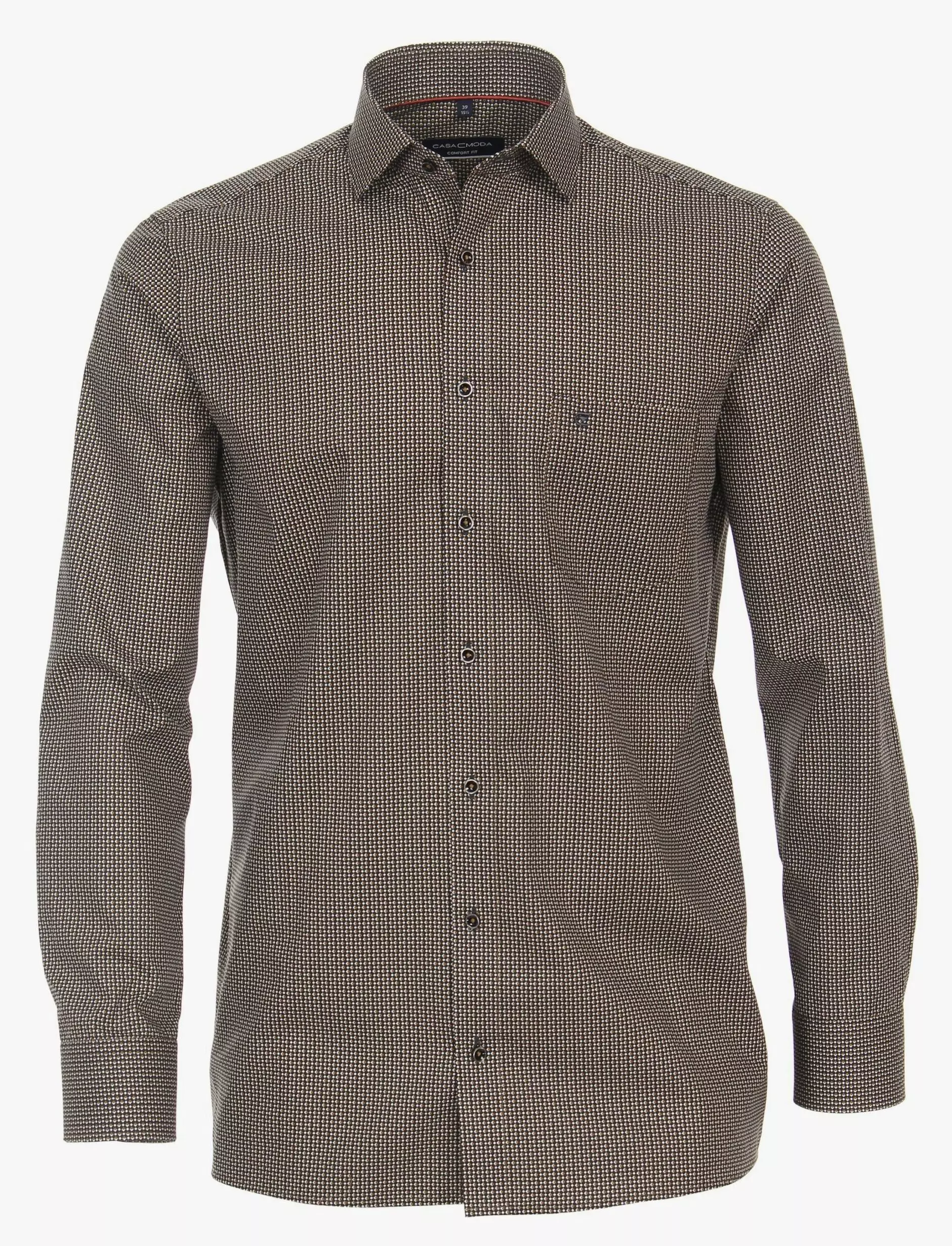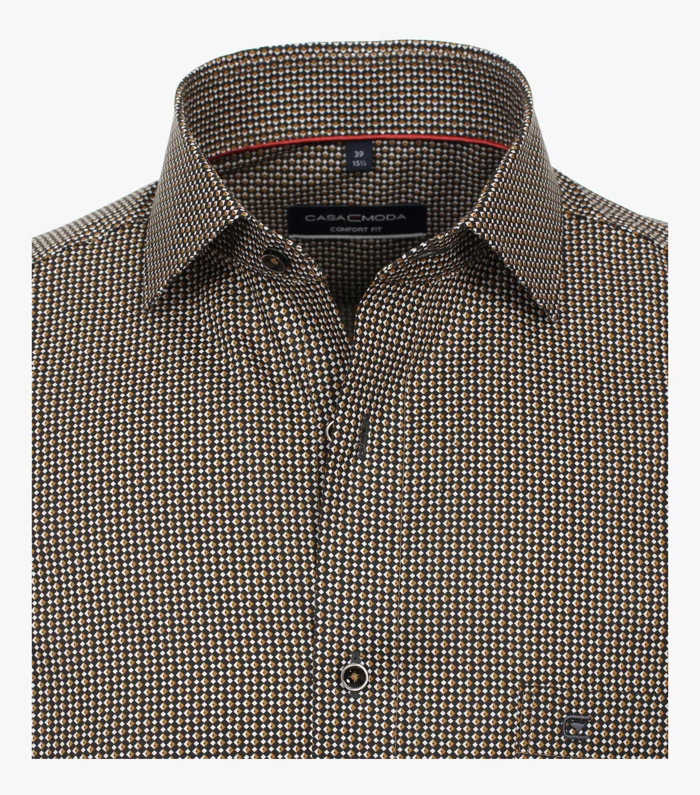 Casa Moda overhemd lange mouw met borstzakje in een zwart, wit en okergeel fantasie design. Model comfort fit in 100%katoen easy care.