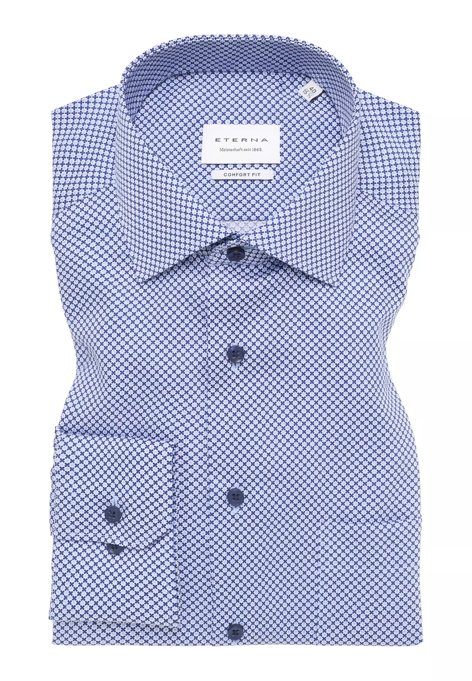 Eterna overhemd lange mouw met borstzakje in blauw ingeweven fantasie design met donkerblauwe knoopjes. Eterna overhemd lange mouw in model comfort fit 100%katoen strijkvrij.