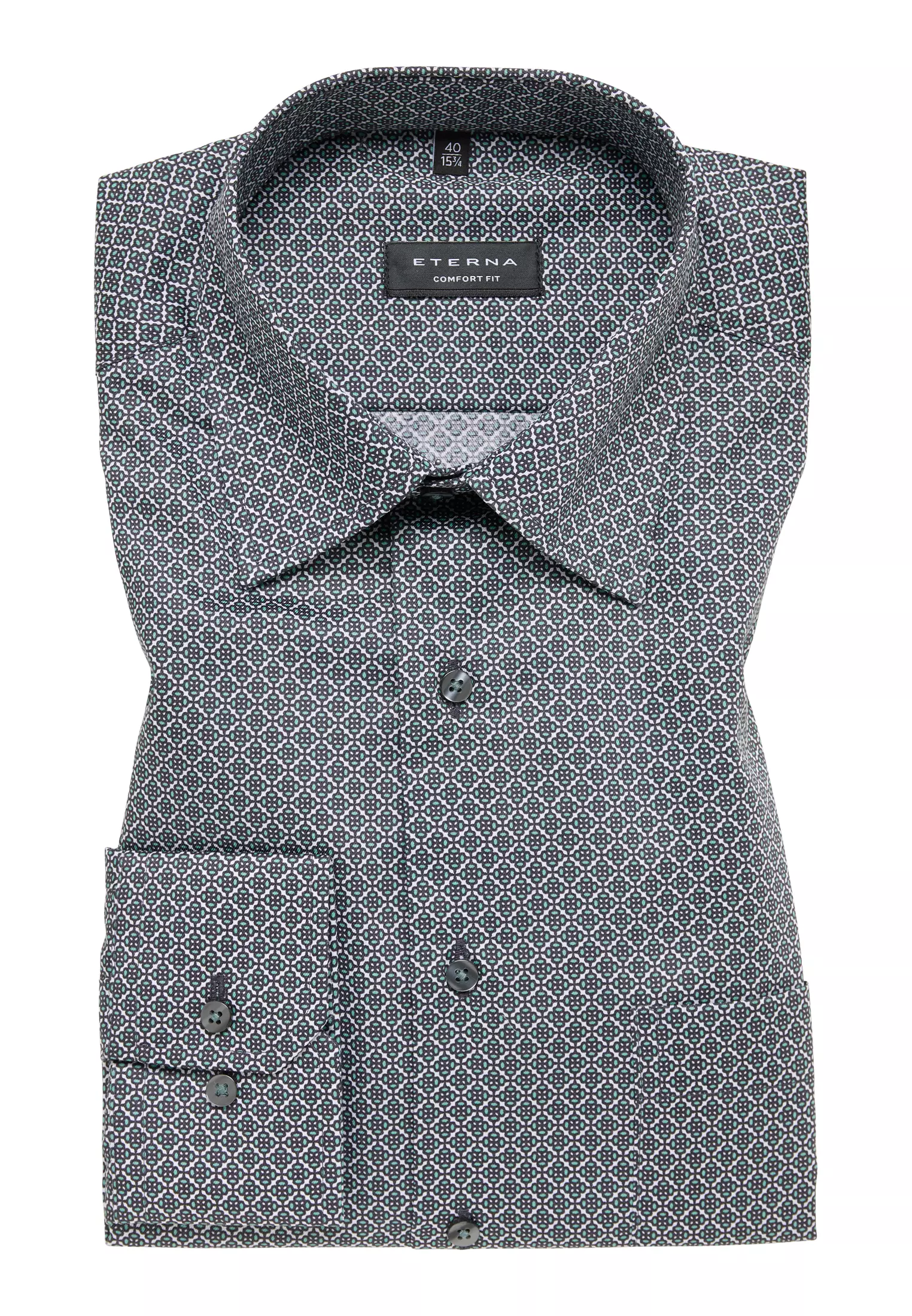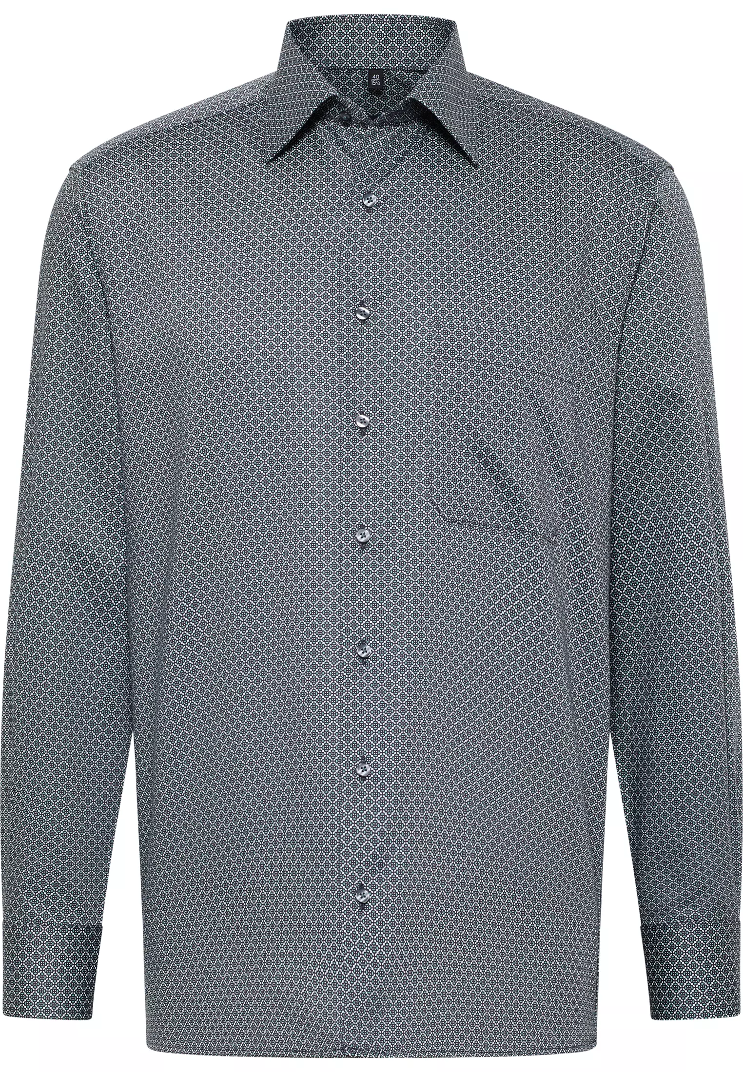 Eterna overhemd lange mouw met borstzakje in een groen met wit fantasie design strijkvrij. Eterna overhemd lange mouw in model comfort fit 100%katoen strijkvrij.
