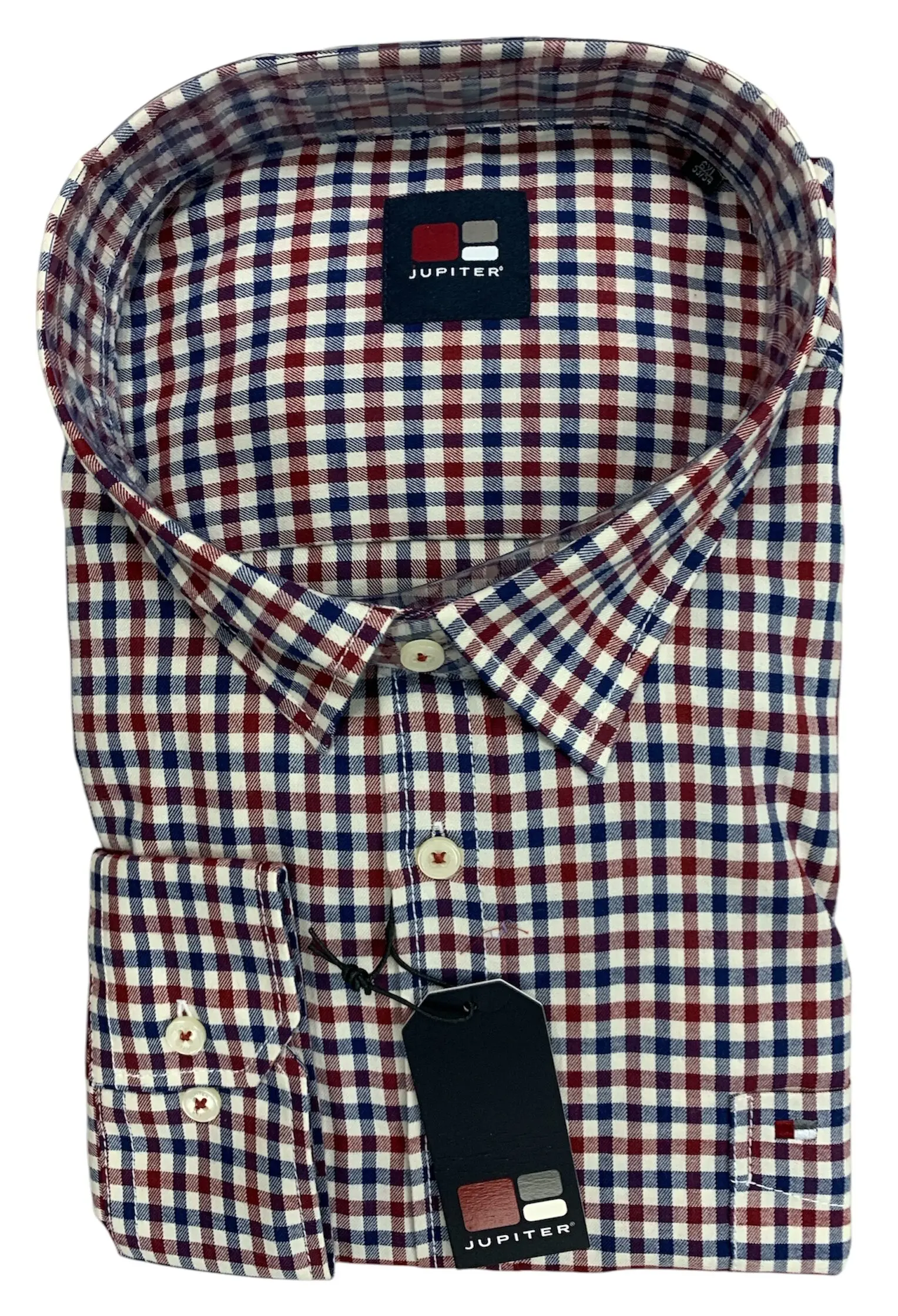 Jupiter overhemd lange mouw in een rood, wit en blauw ruitje. Jupiter overhemd met borstzakje in 100% katoen.