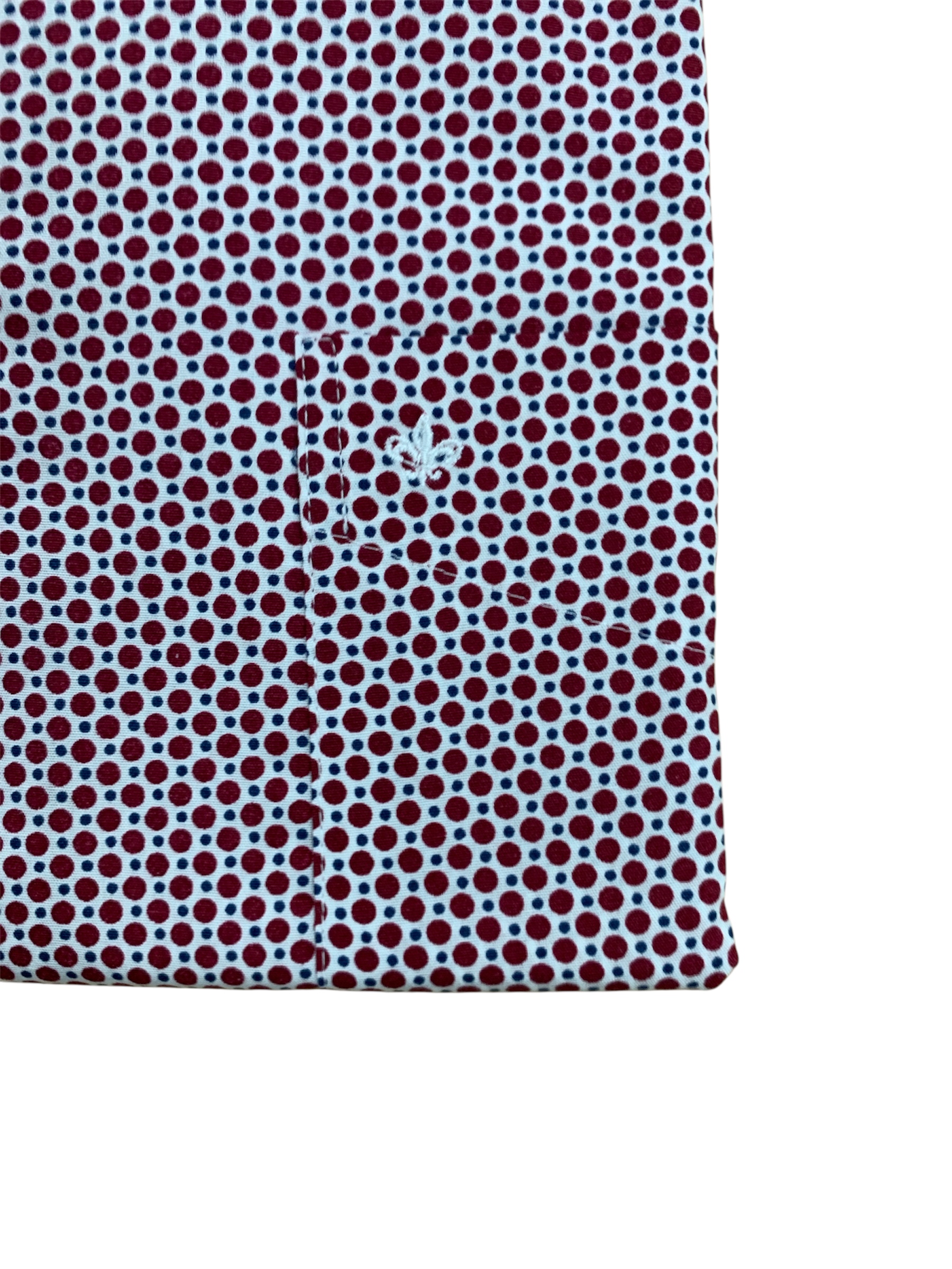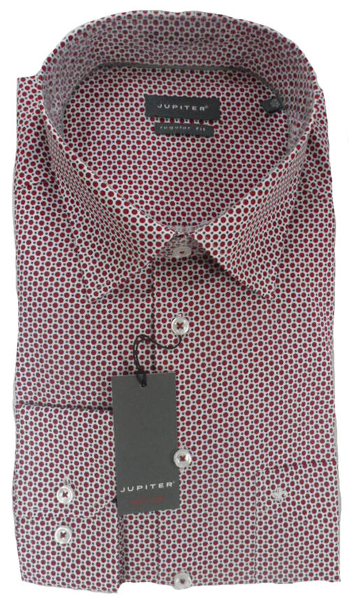 Jupiter overhemd lange mouw met borstzakje in een wit, rood en blauw balletjes patroon. De kwaliteit is 100% katoen.
