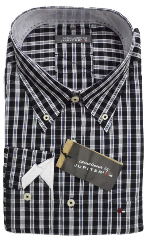 Jupiter overhemd lange mouw met borstzakje in een zwart en grijze ruit met kraag button down. Binnenkant kraag en manchetten zijn afgewerkt met een contrasterend stofje. De kwaliteit is 100% katoen.