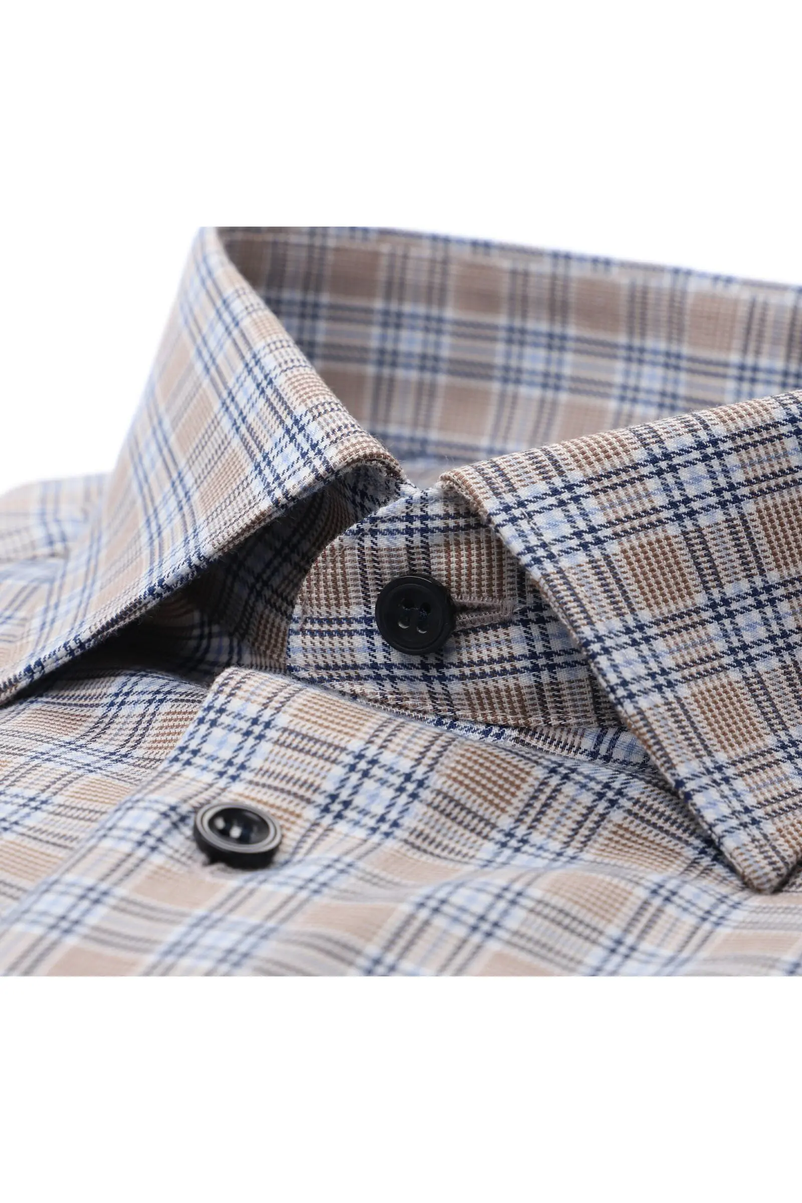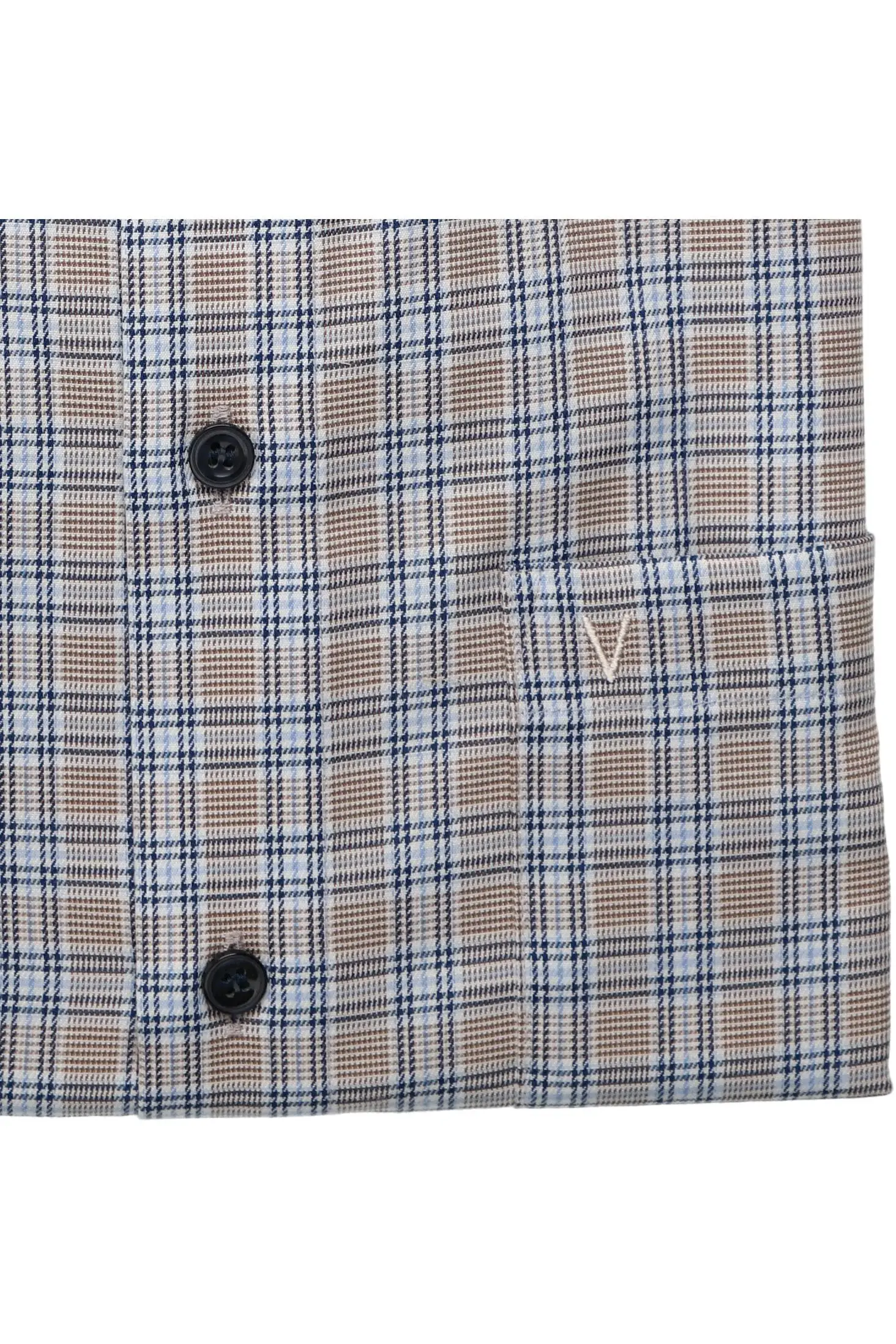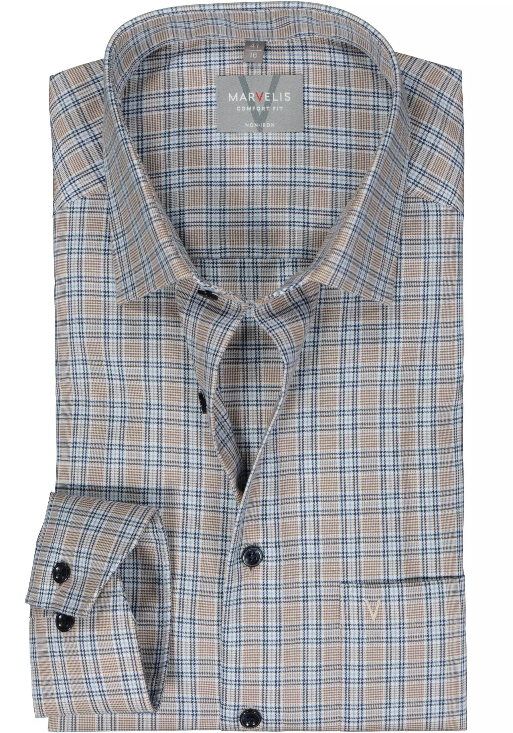 Marvelis overhemd lange mouw met borstzakje in een beige met donker en lichtblauwe ruit design. Overhemd in model comfort fit 100% strijkvrij.