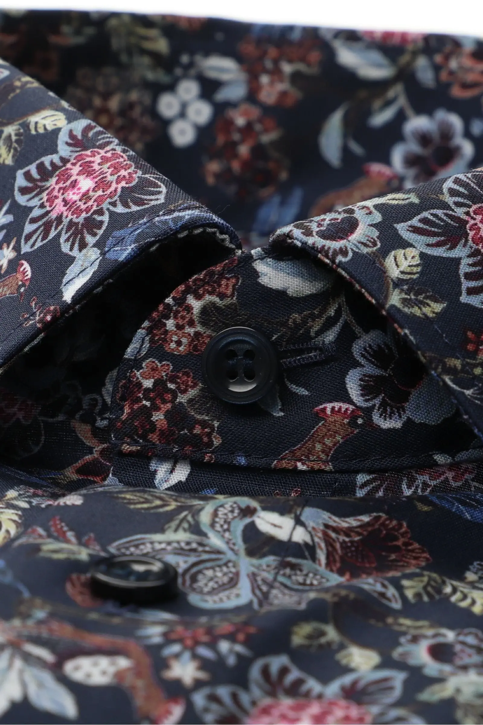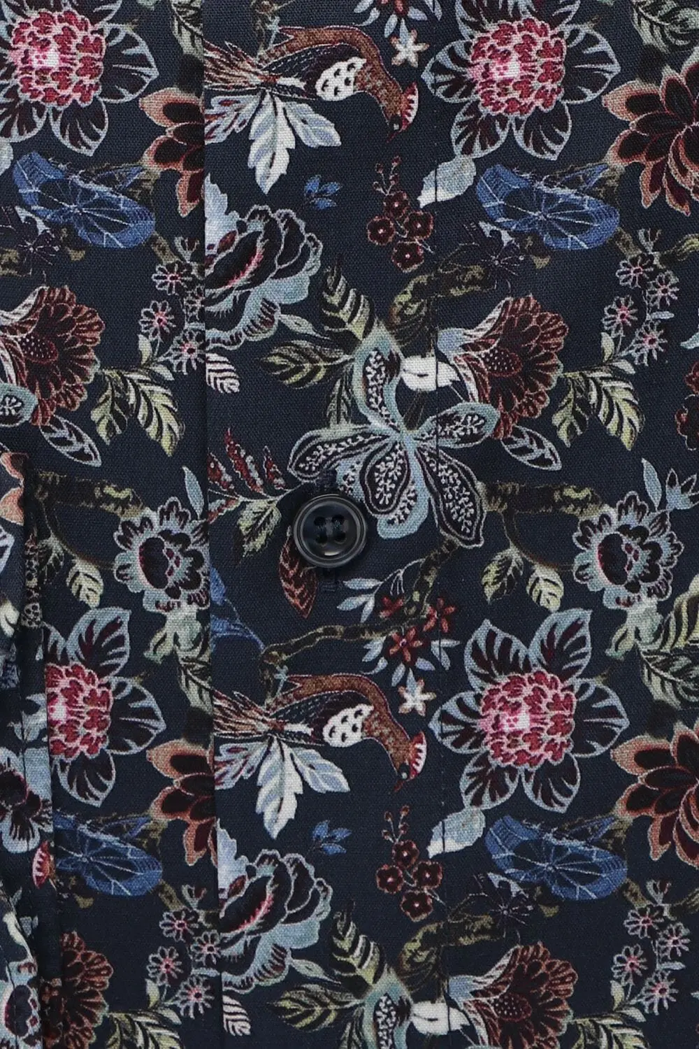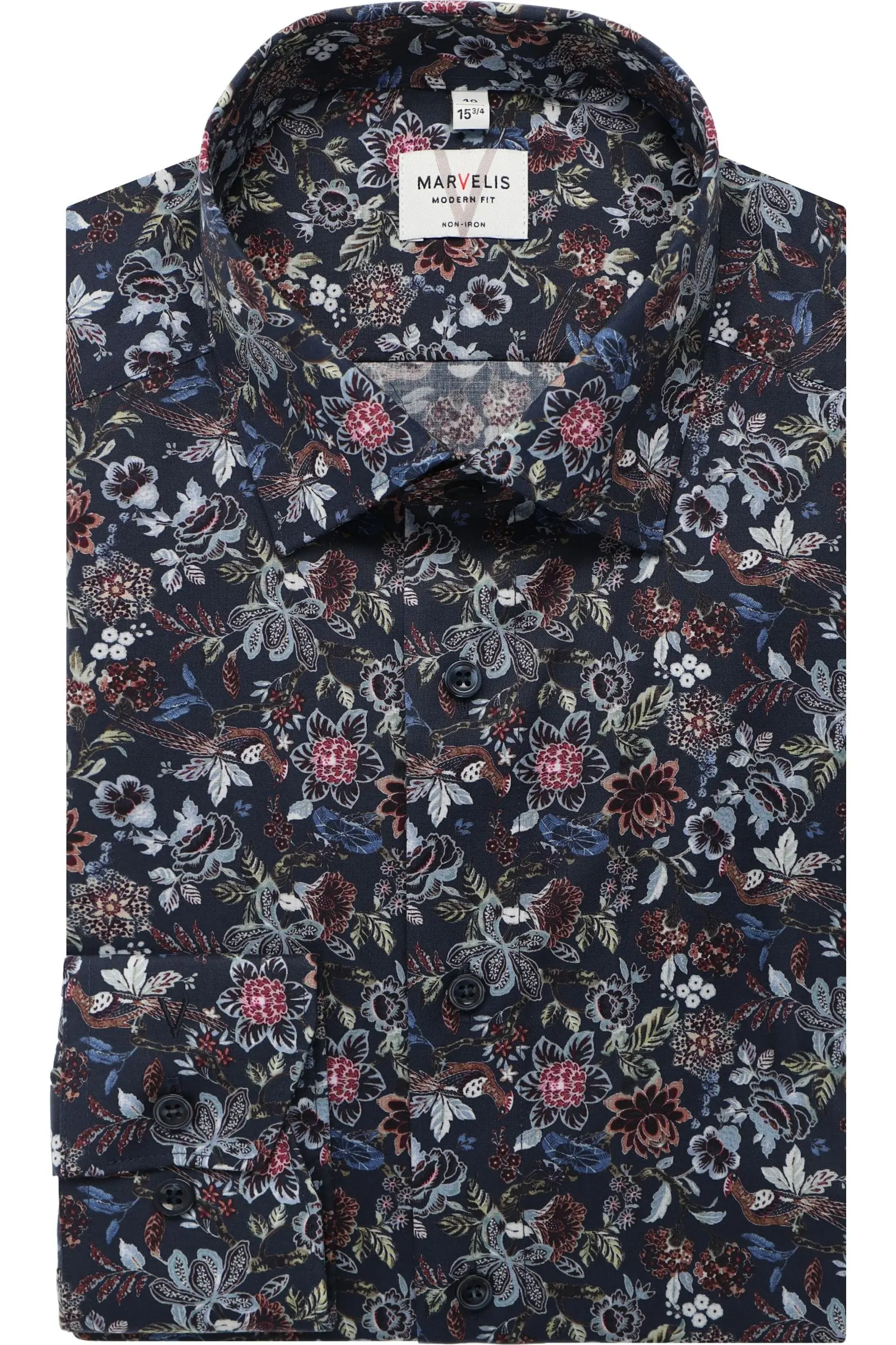 Marvelis grote maat overhemd lange mouw blauw bloem design strijkvrij. Marvelis overhemd lange mouw zonder borstzakje in donkerblauw met meerkleurig bloem design. Overhemd in model comfort fit is gemaakt van 100% katoen strijkvrij.