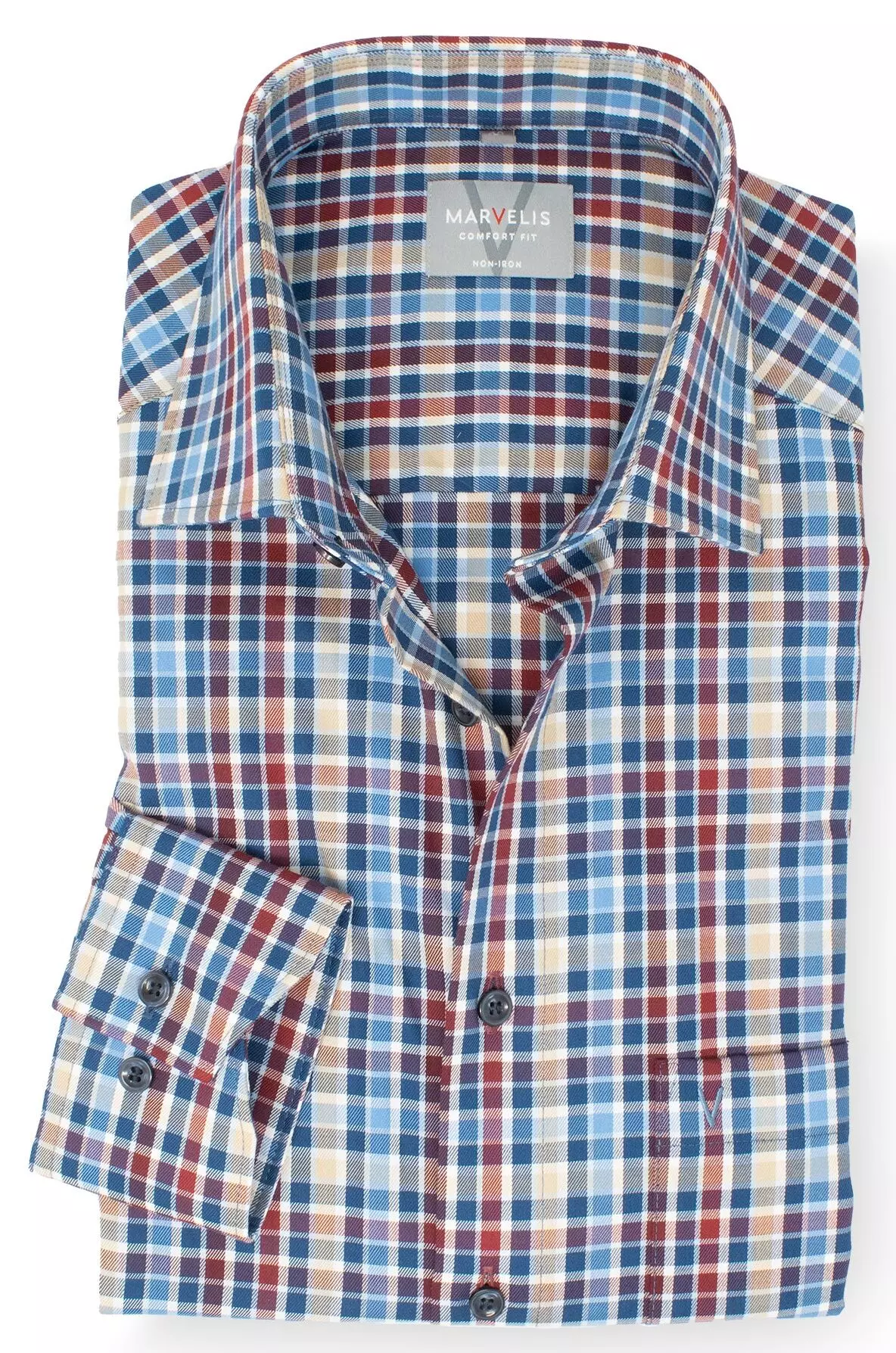 Marvelis grote maat overhemd lange mouw blauw, rood en beige ruitje strijkvrij. Het overhemd heeft lange mouwen met borstzakje. Overhemd in model comfort fit is gemaakt van 100% katoen strijkvrij.