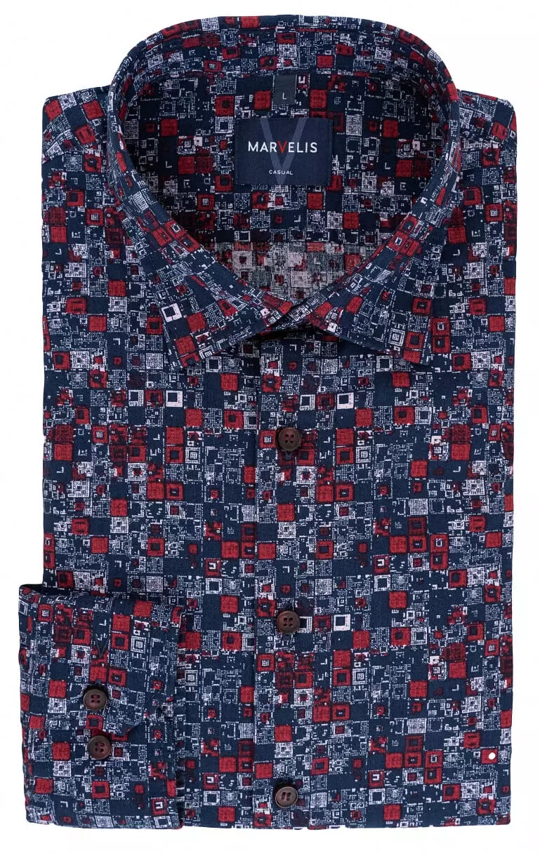 Marvelis grote maat overhemd lange mouw blauw, rood en wit fantasie patroon. Het overhemd heeft lange mouwen zonder borstzakje. Overhemd in model casual fit is gemaakt van 100% katoen.