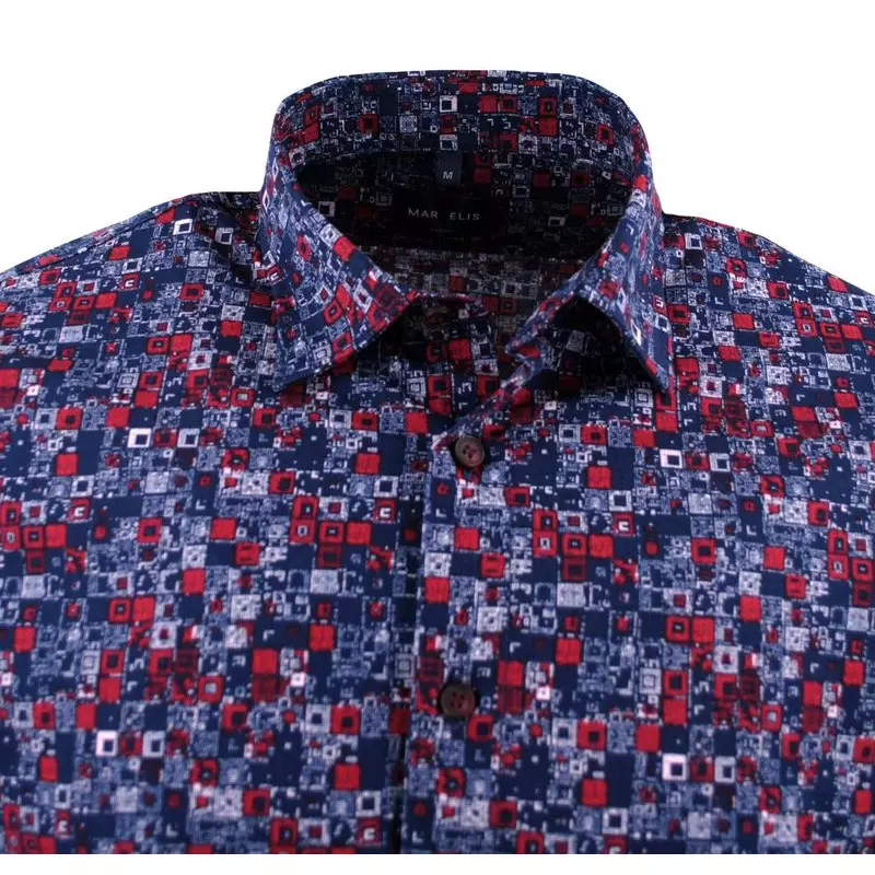 Marvelis overhemd lange mouw blauw, rood en wit fantasie patroon. Het overhemd heeft lange mouwen zonder borstzakje. Overhemd in model casual fit ( dit model valt het zelfde als comfort fit ze noemen deze serie casual fit omdat deze niet strijkvrij zijn) is gemaakt van 100%katoen easy care.