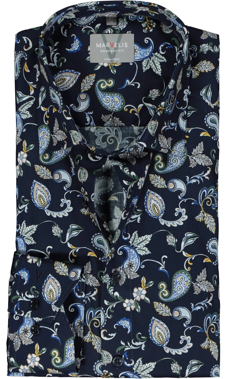 Marvelis overhemd lange mouw in een donkerblauw, wit, groen, blauw en geel paisley design. Overhemd in model comfort fit 100% strijkvrij.