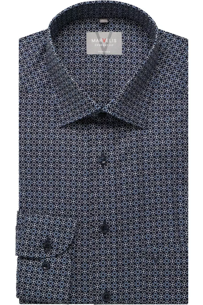Marvelis overhemd lange mouw donkerblauw, taupe en wit design strijkvrij. Het overhemd heeft lange mouwen met borstzakje. Overhemd in model comfort fit is gemaakt van 100%katoen strijkvrij.