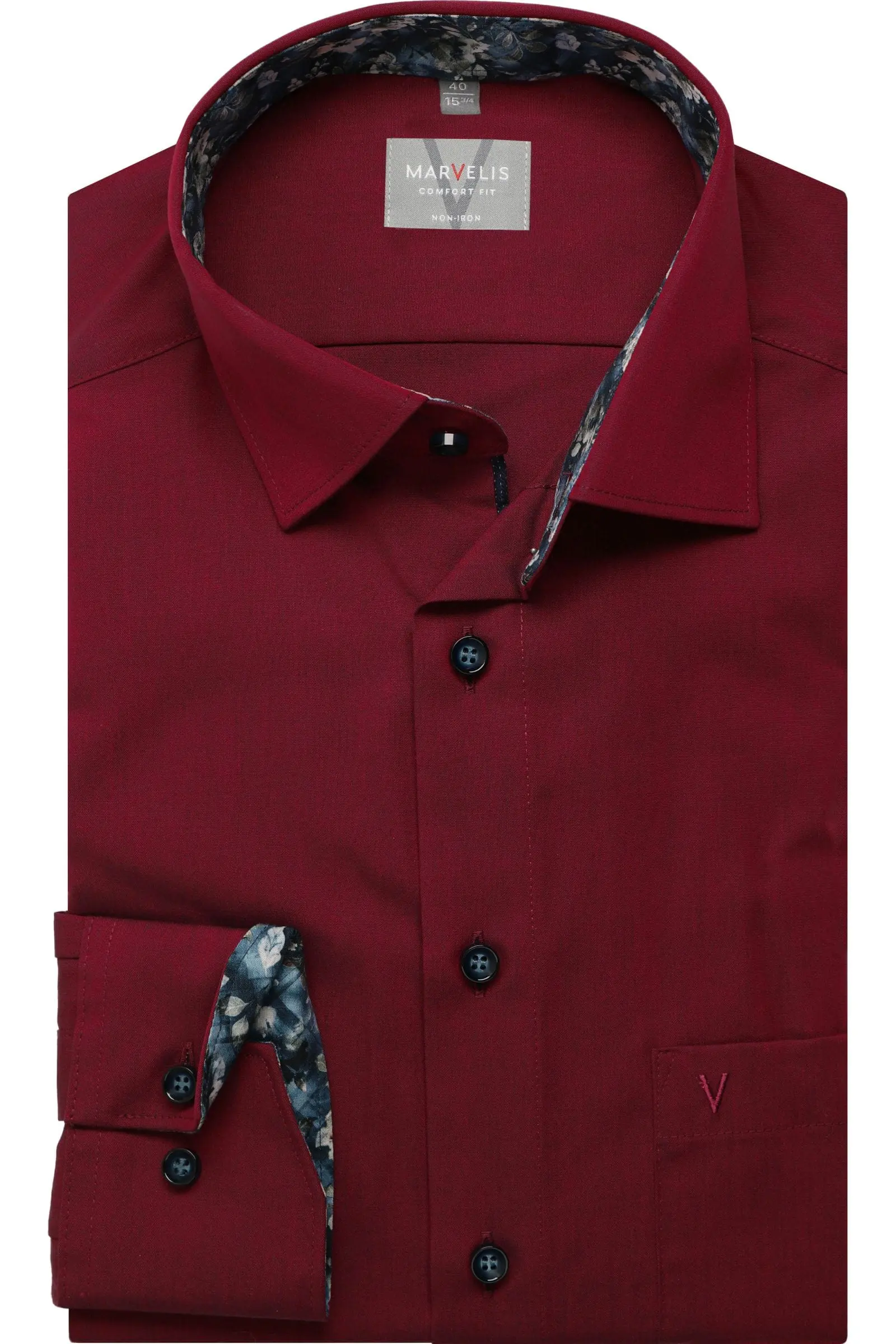 Marvelis overhemd met lange mouw met borstzakje in donkerrood. Binnenkant kraag en manchetten zijn afgewerkt met een contrasterend stofje. Overhemd in model comfort fit is gemaakt van 100% katoen strijkvrij.