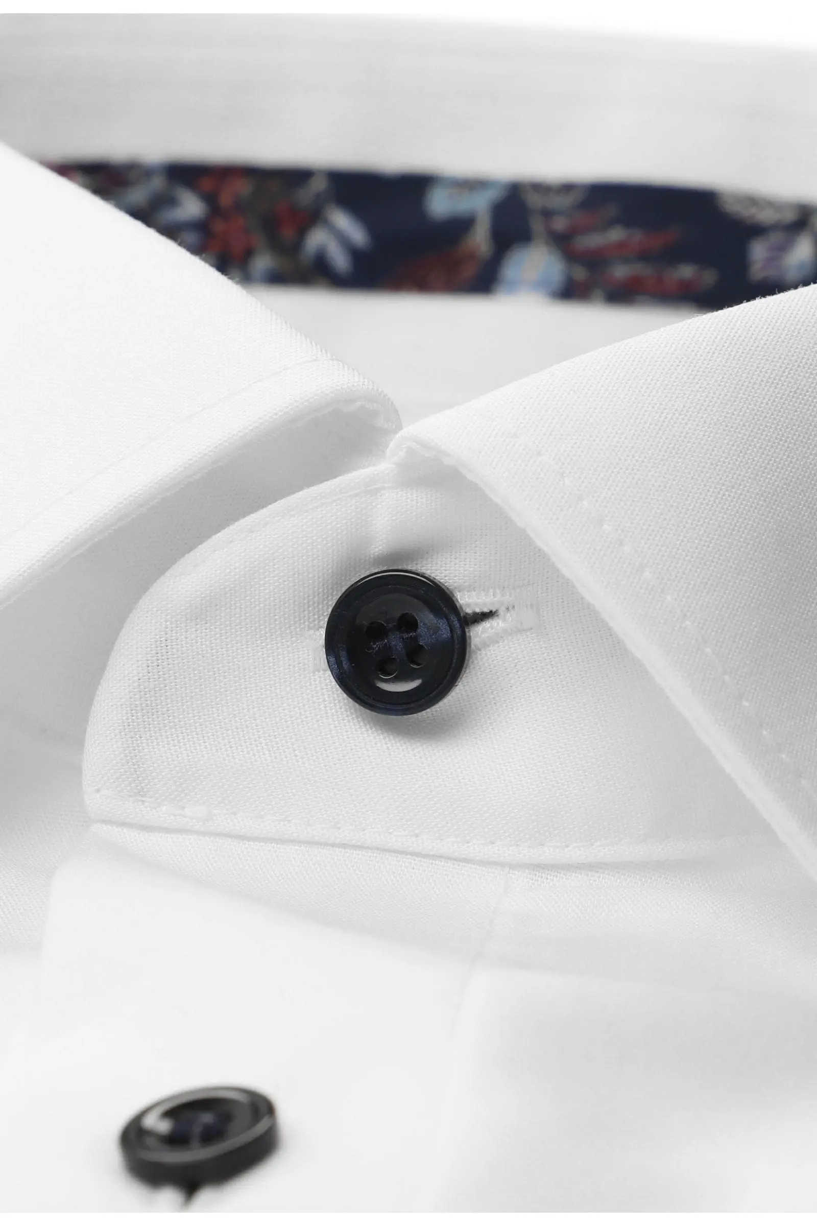 Marvelis overhemd lange mouw met borstzakje in wit met blauwe knoopjes. De binnenkant van de manchetten en kraag zijn met een contrasterend stofje afgewerkt. Overhemd in model comfort fit is gemaakt van 100% katoen strijkvrij.