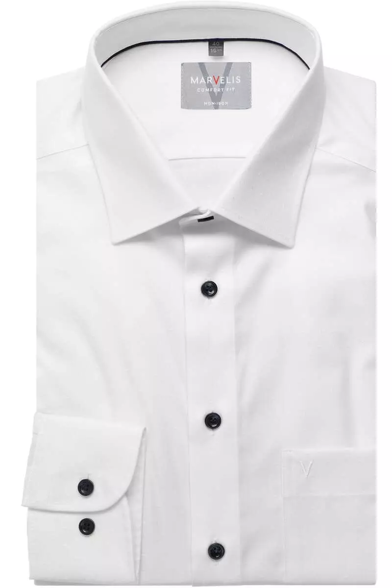 Marvelis overhemd lange mouw met borstzakje in wit met zwarte knoopjes. Overhemd in model comfort fit is gemaakt van 100%katoen strijkvrij.