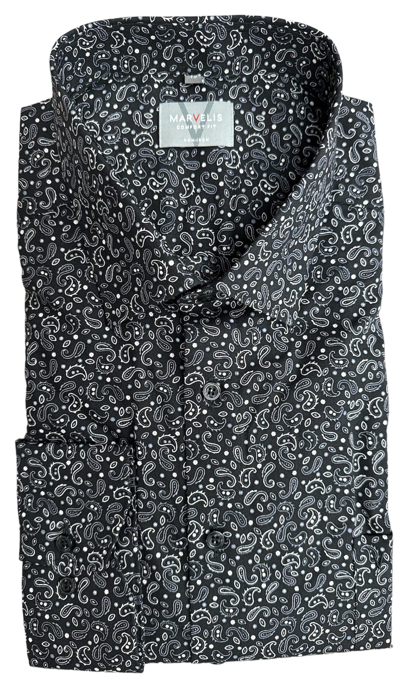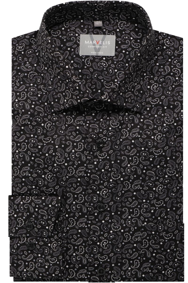 Marvelis overhemd zwart paisley. Marvelis overhemd lange mouw met borstzakje in een zwart, grijs en wit paisley design. Overhemd in model comfort fit 100% strijkvrij.