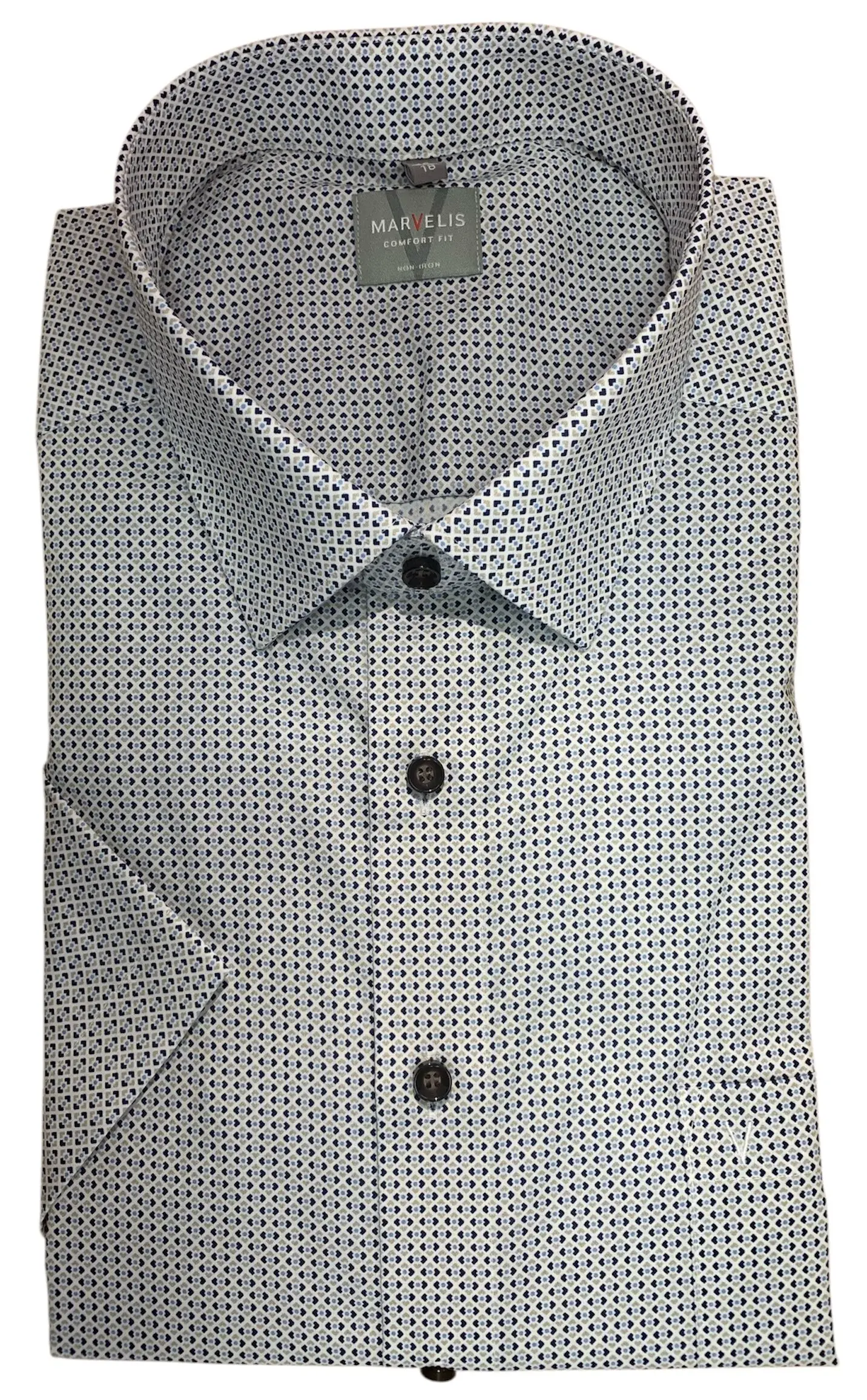 Marvelis overhemd korte mouw blauw beige dessin. Marvelis overhemd korte mouw met borstzakje. Overhemd in model comfort fit 100% katoen strijkvrij.