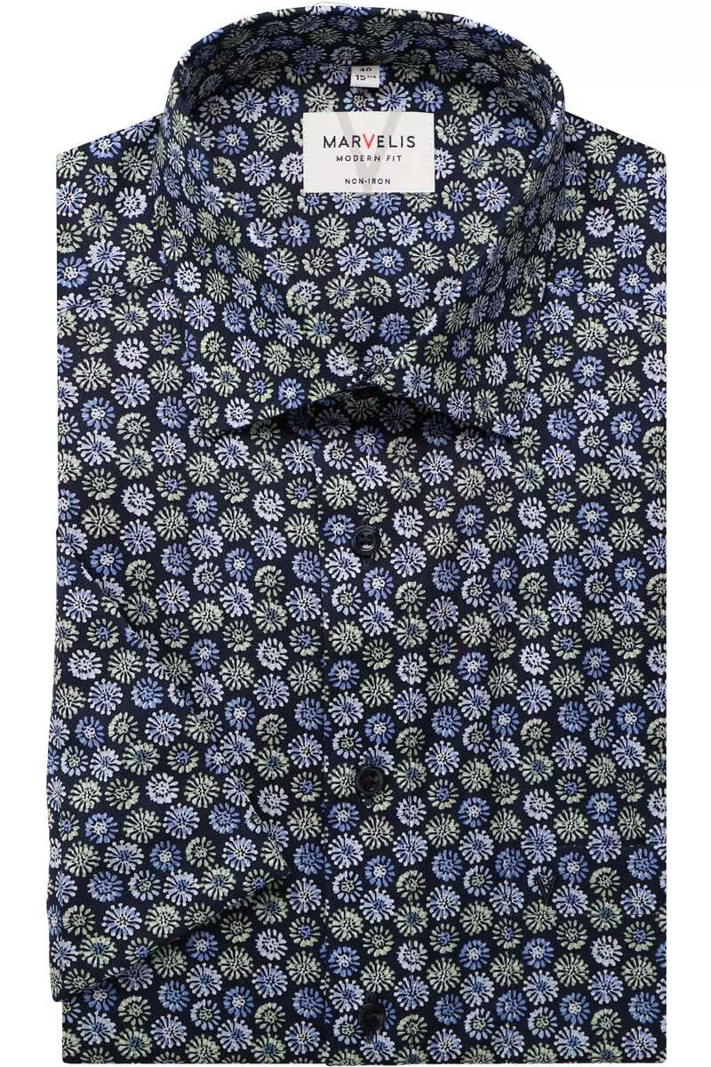 Marvelis overhemd korte mouw met een borstzakje in een blauw en groen fantasie design. Overhemd is gemaakt van 100%katoen strijkvrij. Marvelis overhemd in model comfort fit.
