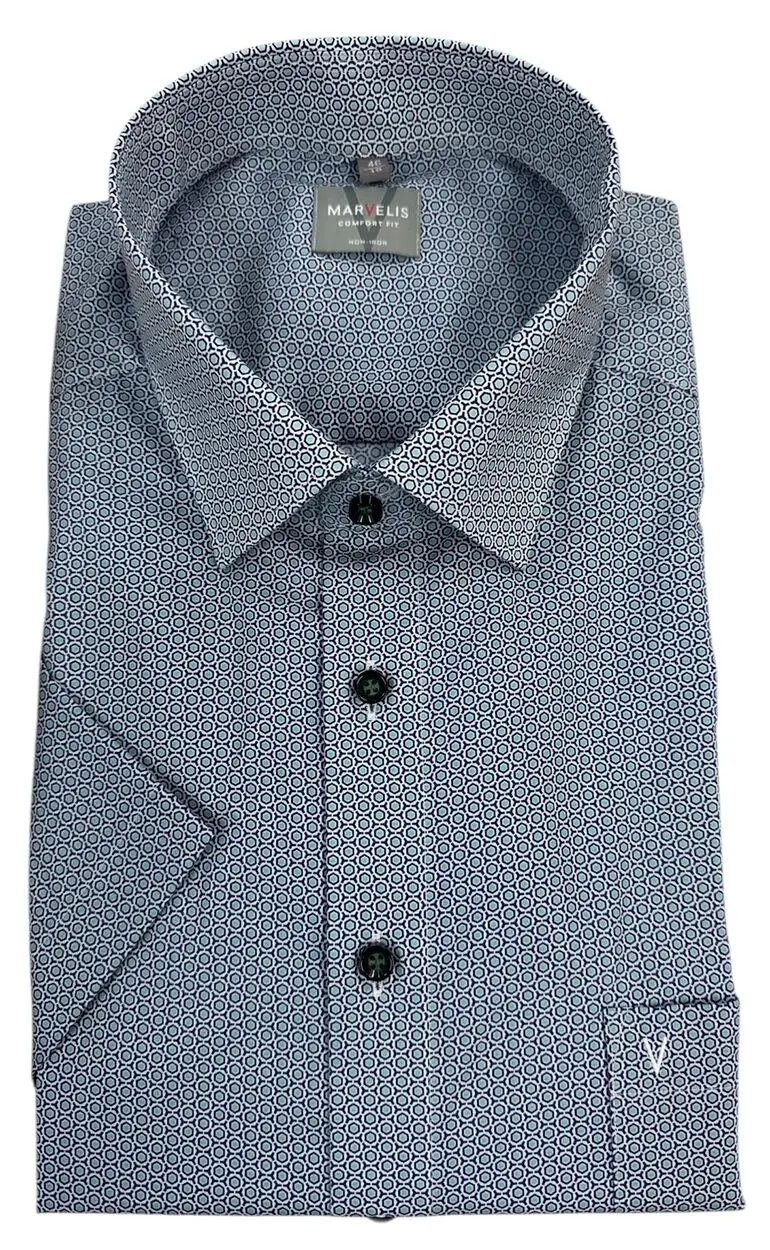Marvelis overhemd korte mouw blauw en groen fantasie dessin. Marvelis overhemd korte mouw met borstzakje in een blauw en groen fantasie dessin. Overhemd in model comfort fit 100% katoen strijkvrij.