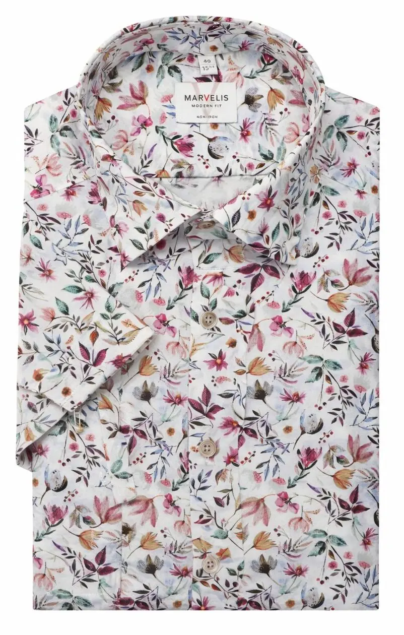 Marvelis overhemd korte mouw kleurrijk bloem dessin. Marvelis overhemd korte mouw zonder borstzakje in diverse kleuren bloem dessin. Overhemd in model comfort fit 100% katoen strijkvrij.