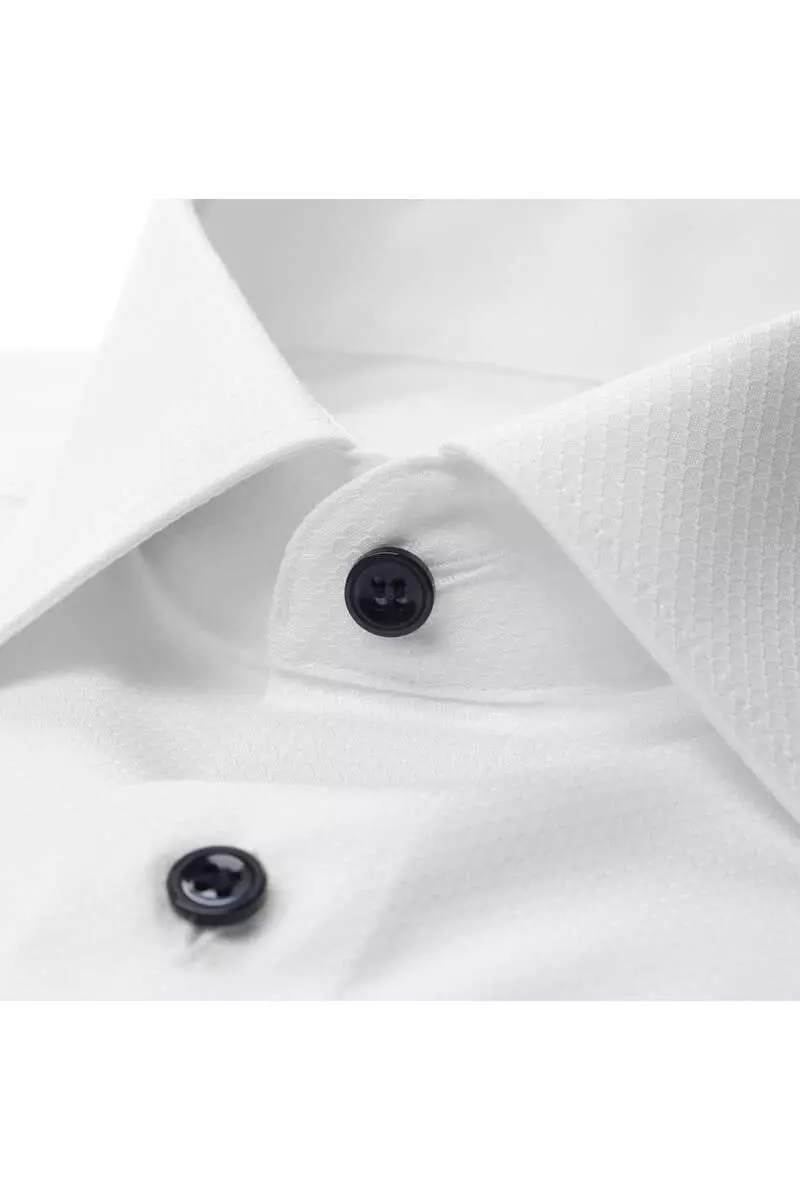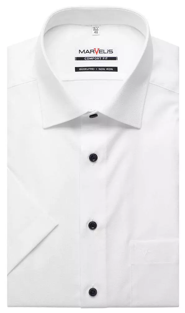 Marvelis overhemd korte mouw met borstzakje wit met ingeweven werkje en blauwe knoopjes strijkvrij. Model comfort fit 100% katoen strijkvrij.