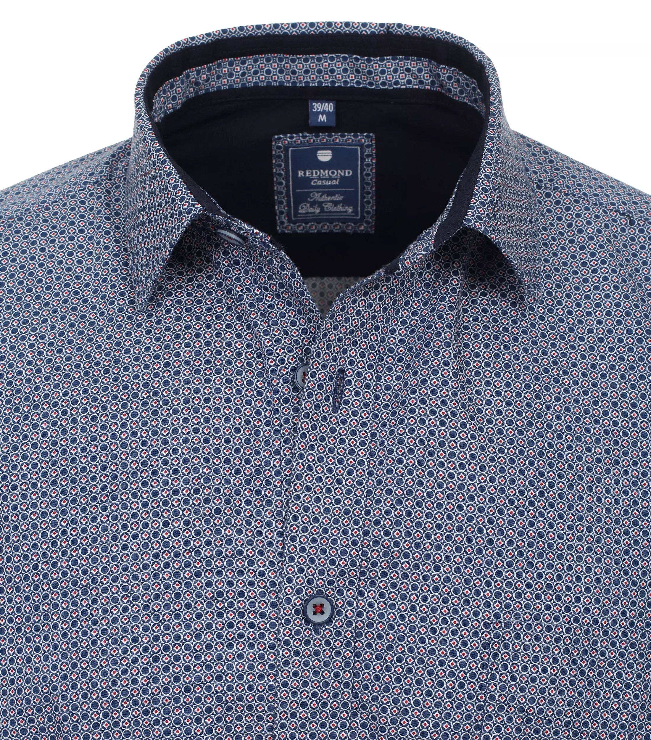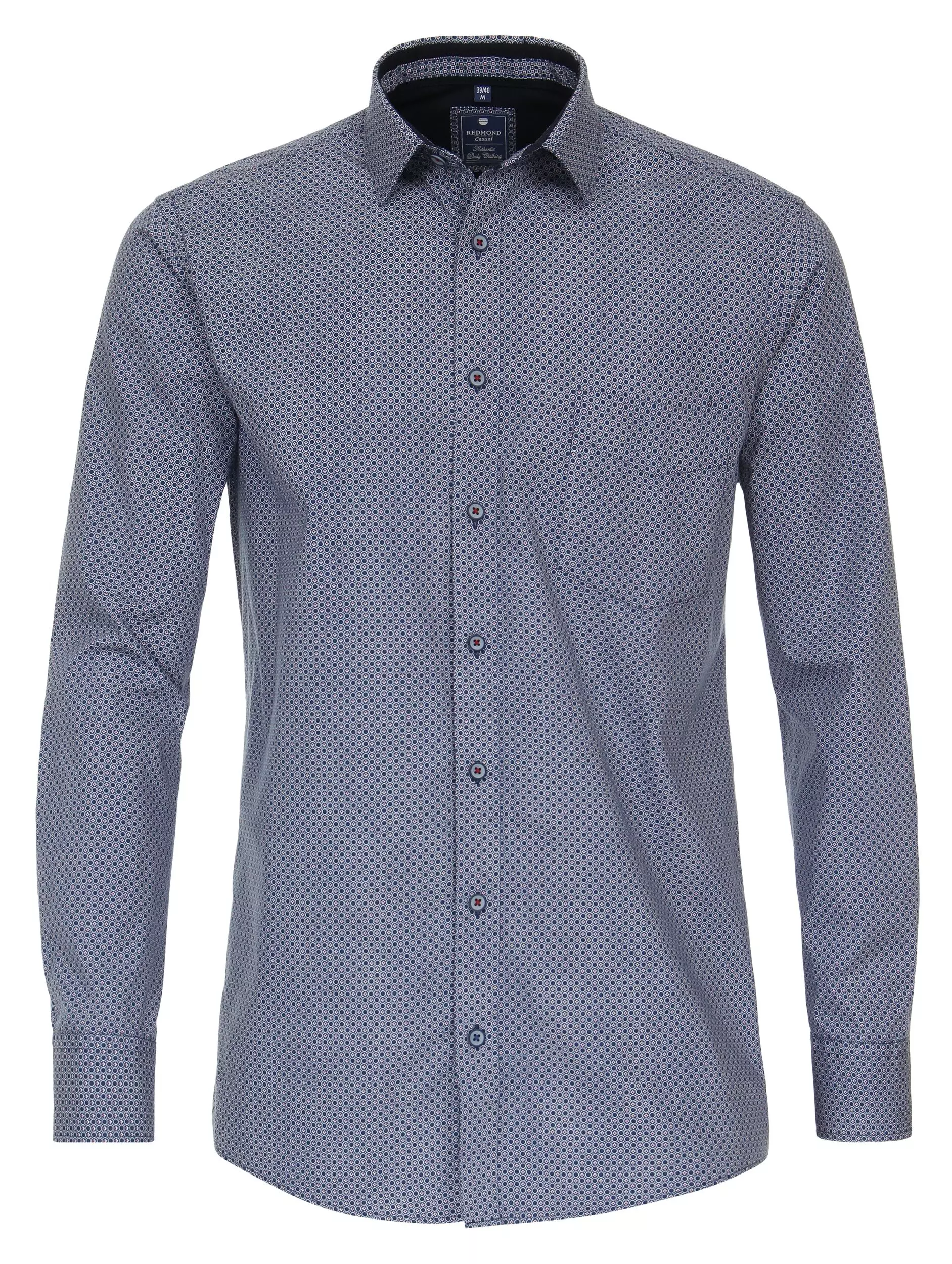 Redmond overhemd lange mouw met kraag button down in een blauw en rood fantasie patroon.