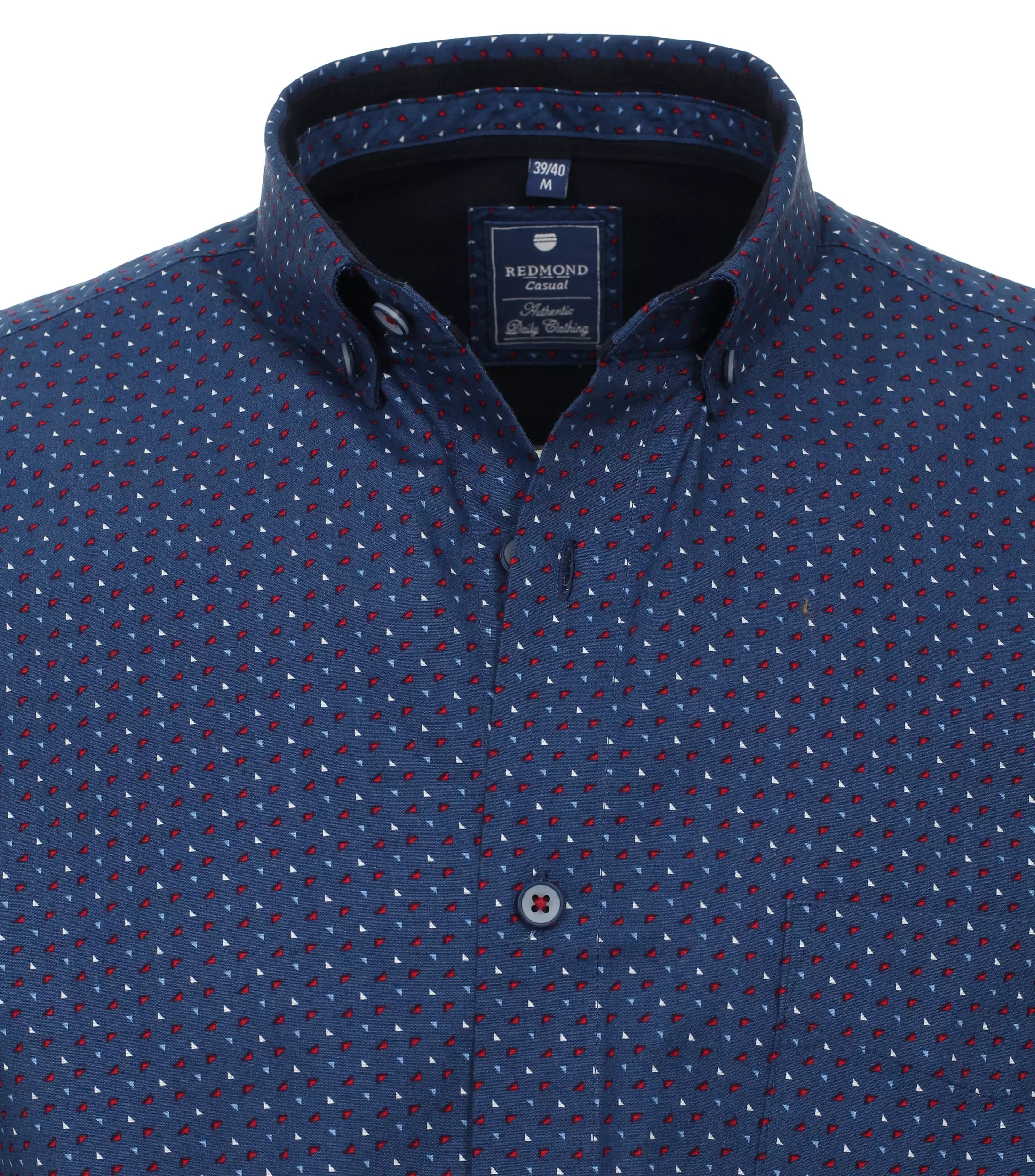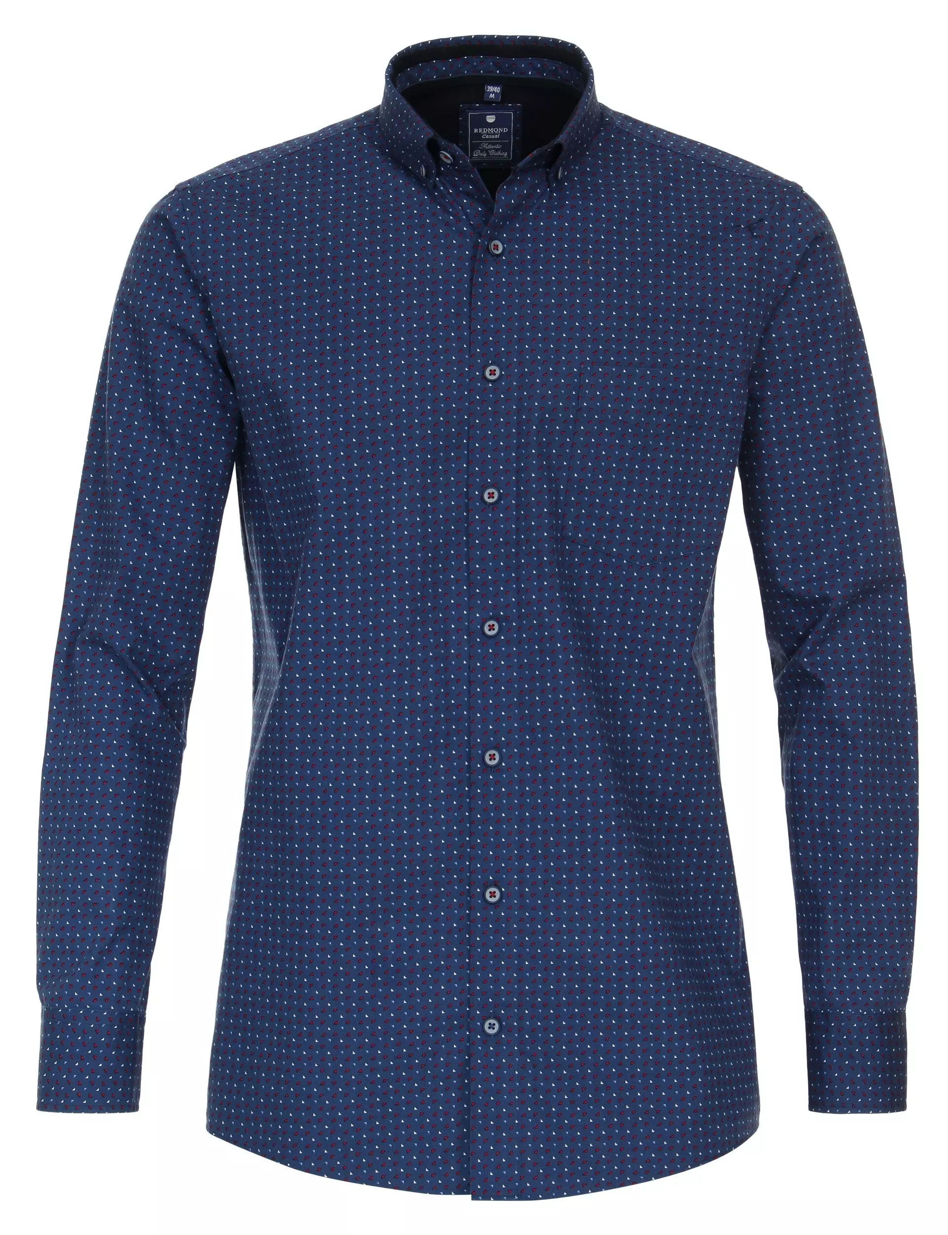 Redmond overhemd grote maat lange mouw blauw, rood en wit fantasie patroon. Redmond overhemd lange mouw met borstzakje. 100% katoen.