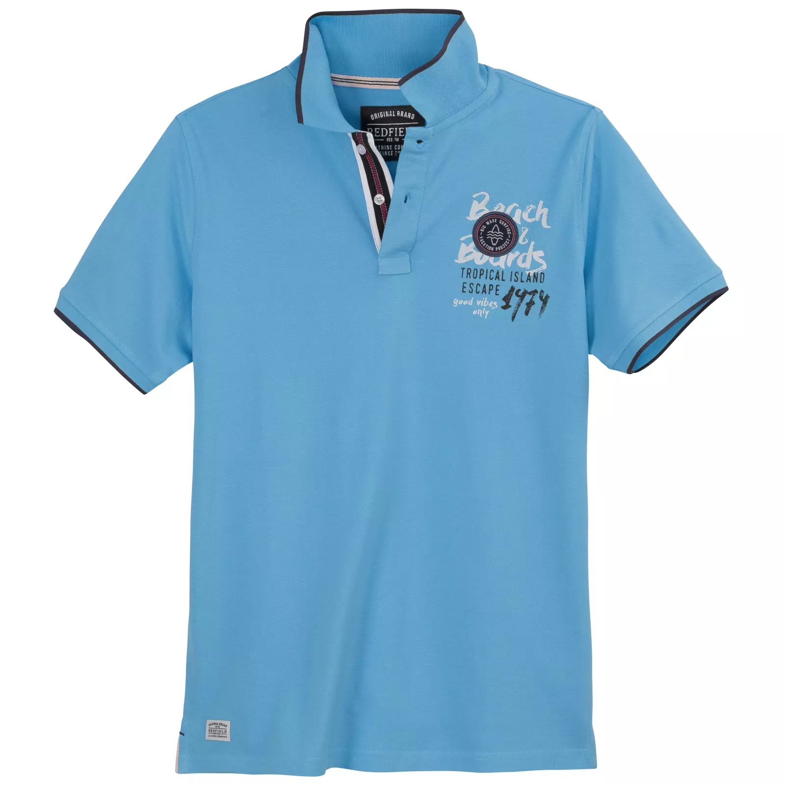 Redfield poloshirt korte mouw blauw met kleur accenten en applicaties. Poloshirt korte mouw polokraag met 2 knoopjes. De kwaliteit is 100% katoen pique.