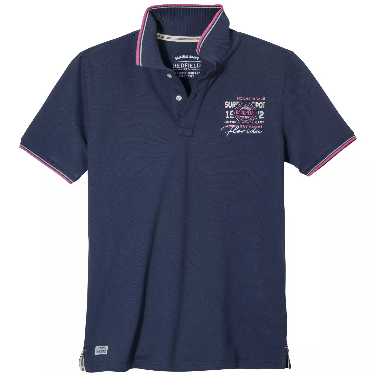 Redfield grote maat poloshirt korte mouw donkerblauw Miami Beach. Poloshirt korte mouw polokraag met 2 knoopjes en sportieve applicatie. De kwaliteit is 100% katoen pique.