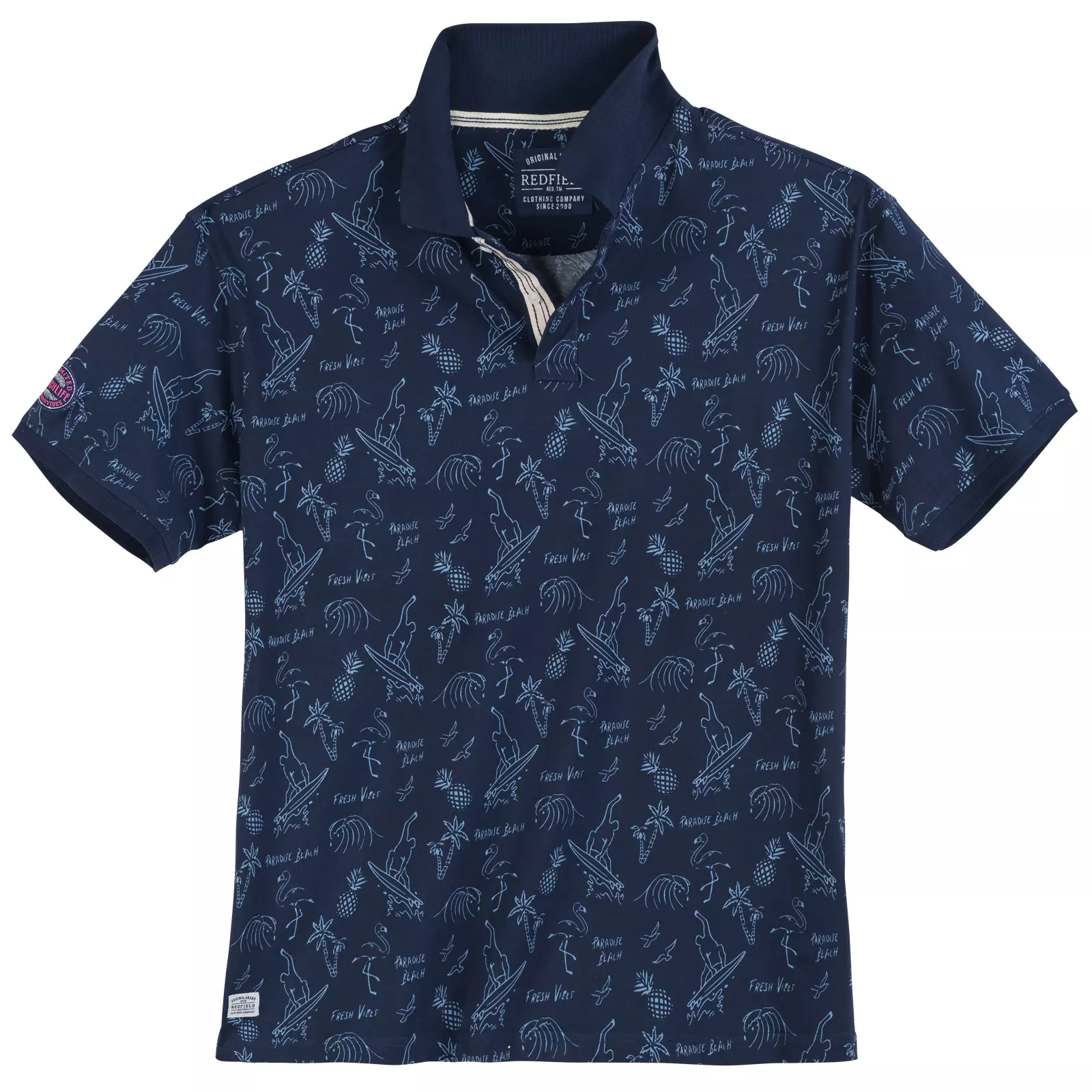 Redfield poloshirt korte mouw in donkerblauw met Paradise Beach design. Poloshirt korte mouw polokraag met 2 knoopjes. De kwaliteit is 100% katoen jersey.