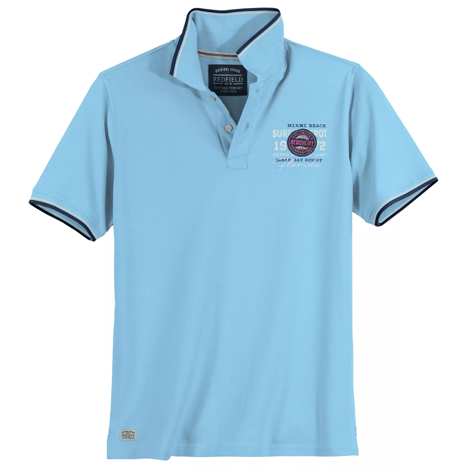 Redfield grote maat poloshirt korte mouw lichtblauw Miami Beach. Poloshirt korte mouw polokraag met 2 knoopjes en sportieve applicatie. De kwaliteit is 100% katoen pique.