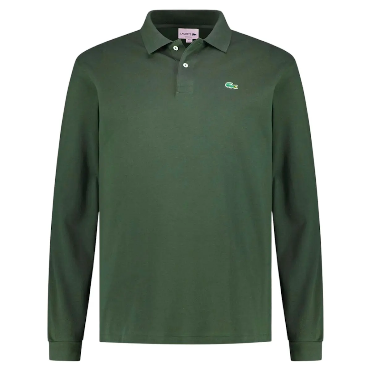 Lacoste poloshirt lange mouw met polokraag knoop in kaaiman groen. De kwaliteit van deze polo is 100% katoen. Model classic fit, ruim vallend niet getailleerd.