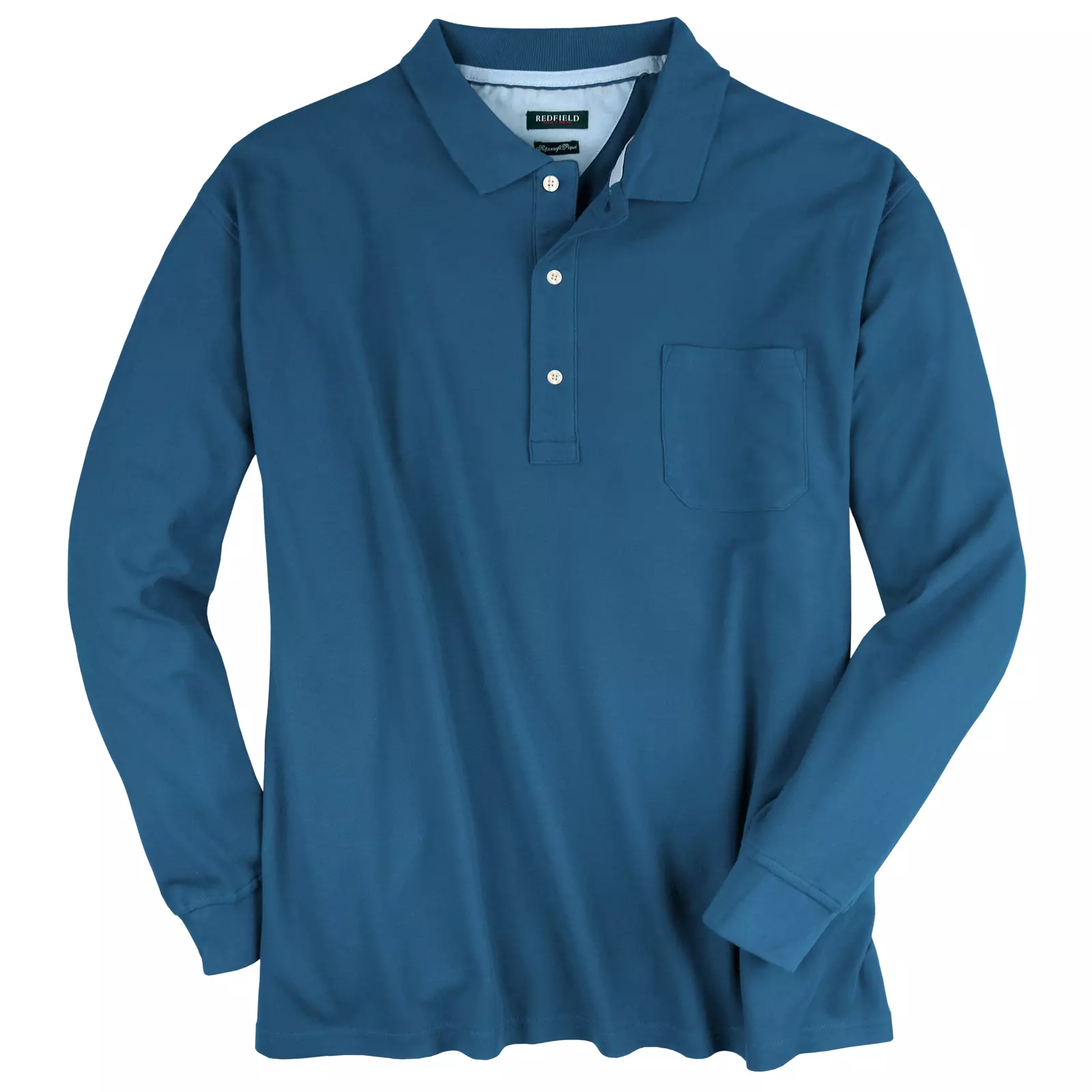 Redfield poloshirt lange mouw en polokraag knoop in uni blauw met op de linkerkant van de borst een borstzakje.