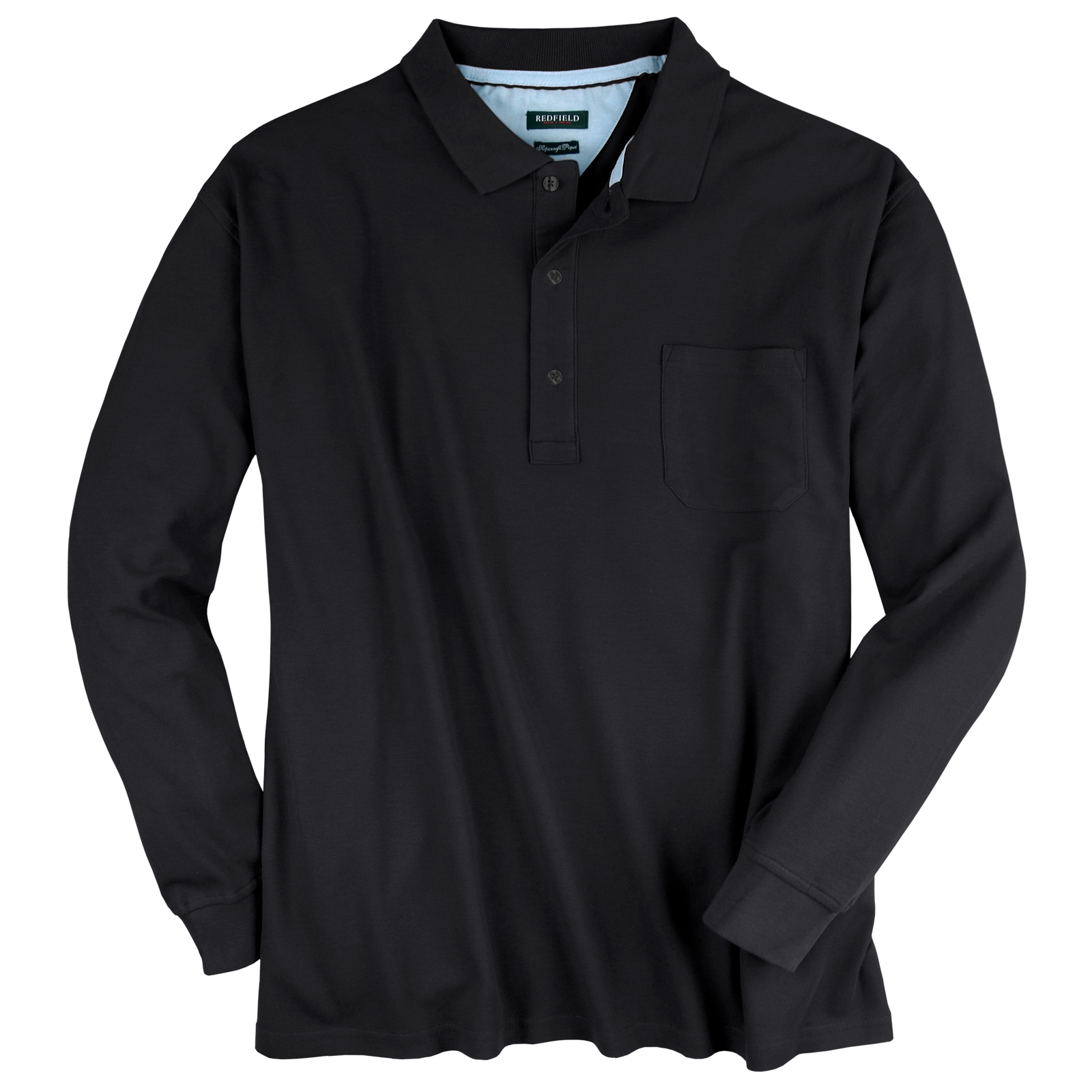 Redfield poloshirt lange mouw en polokraag knoop in uni zwart met op de linkerkant van de borst een borstzakje. De kwaliteit van deze polo is 100% katoen pique.