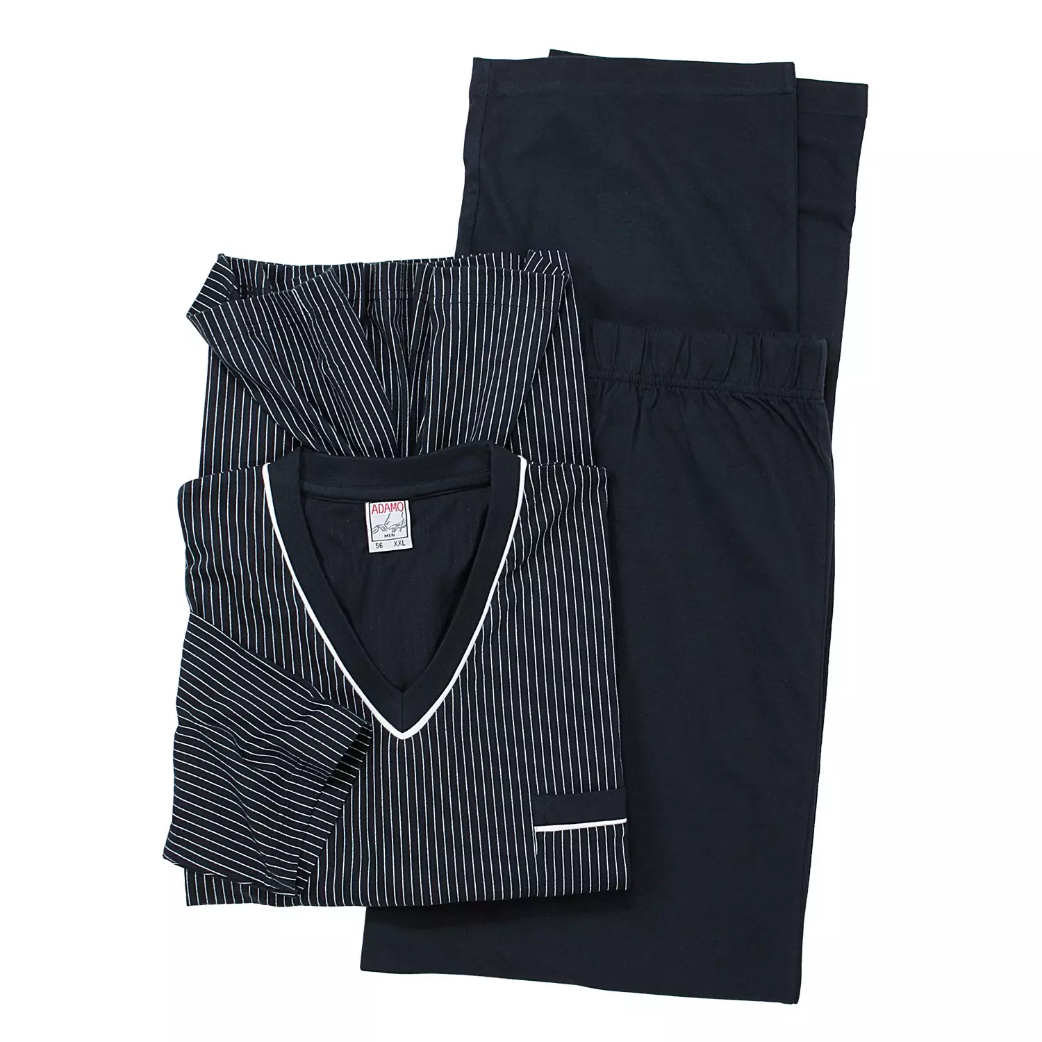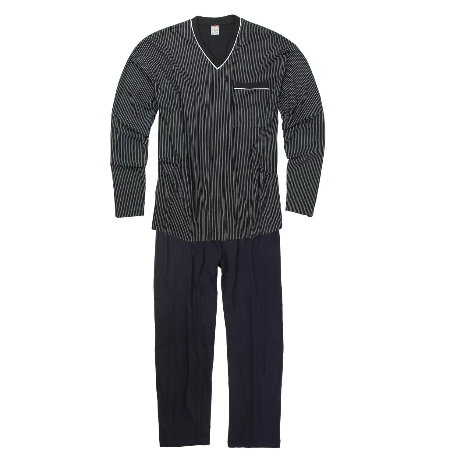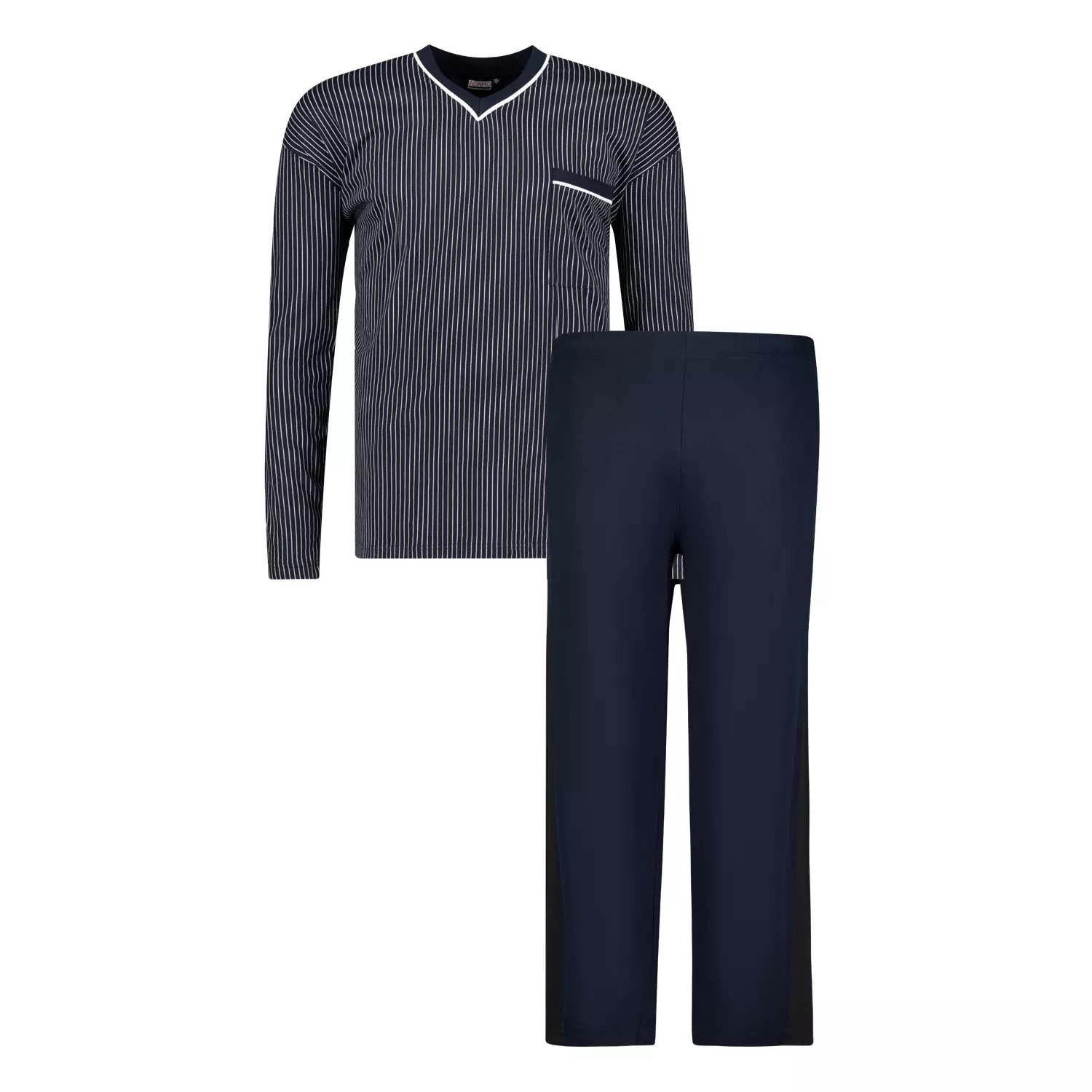 Adamo heren pyjama in een blauw met witte lengte streep model Gustav, Pyjamabroek donkerblauw met elastische band en het bovenstuk donkerblauw gestreept met v-hals. De kwaliteit is 100% katoen.