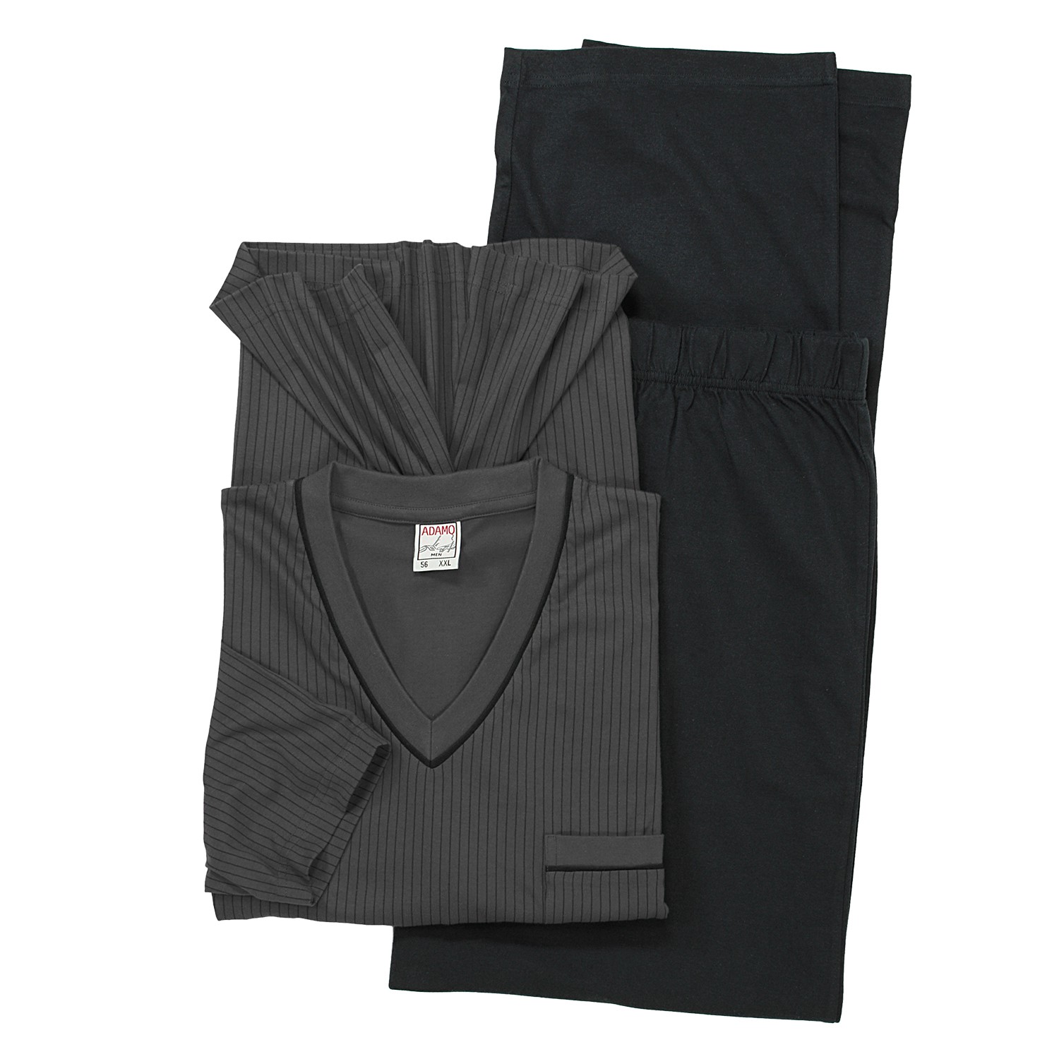 Adamo grote maat pyjama antracietgrijs v-hals. Model Gustav, Pyjamabroek donkergrijs met elastische band en het bovenstuk antracietgrijs gestreept met v-hals. De kwaliteit is 100% katoen.