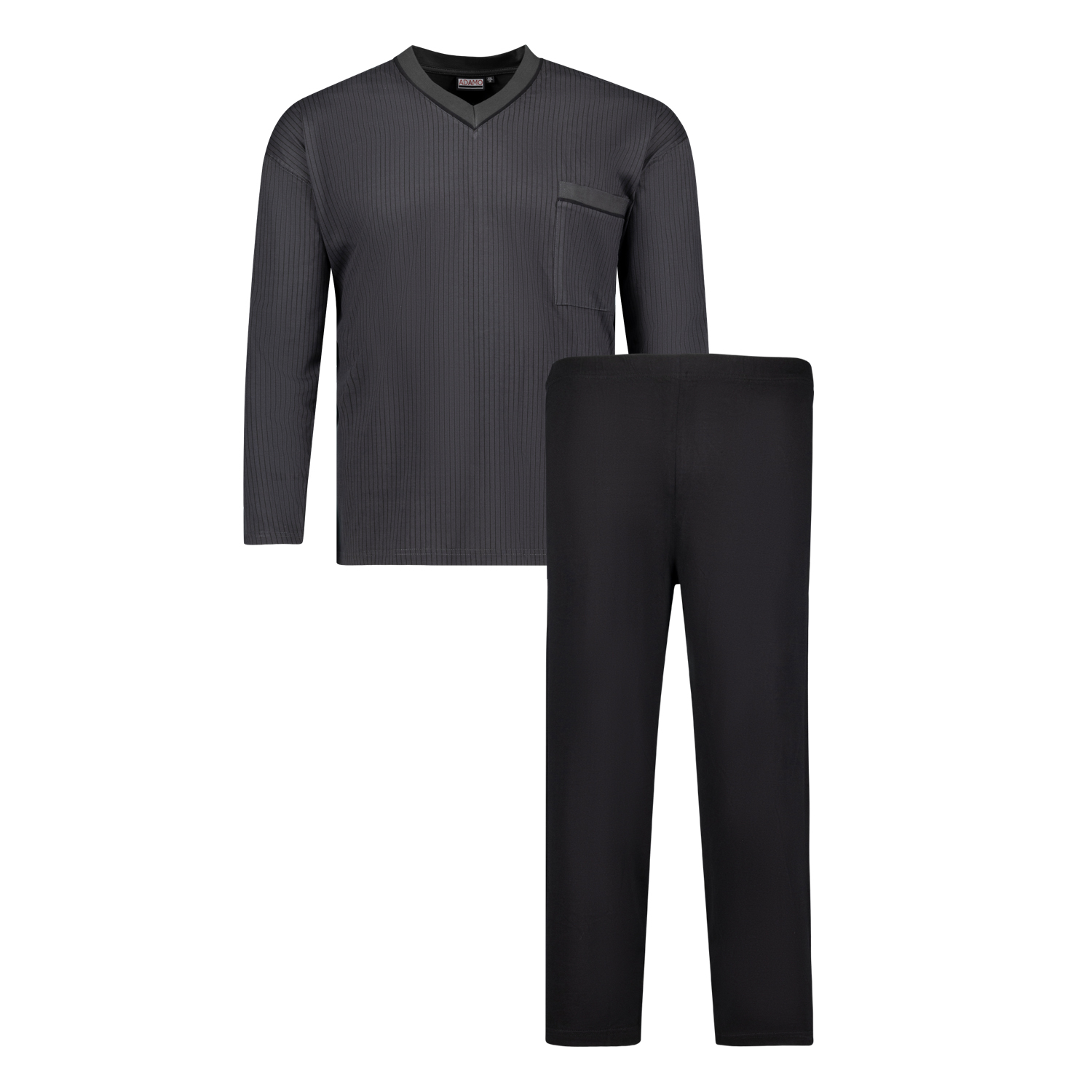 Adamo heren pyjama in een antracietgrijs met lengte streep model Gustav, Pyjamabroek donkergrijs met elastische band en het bovenstuk antracietgrijs gestreept met v-hals. De kwaliteit is 100% katoen.