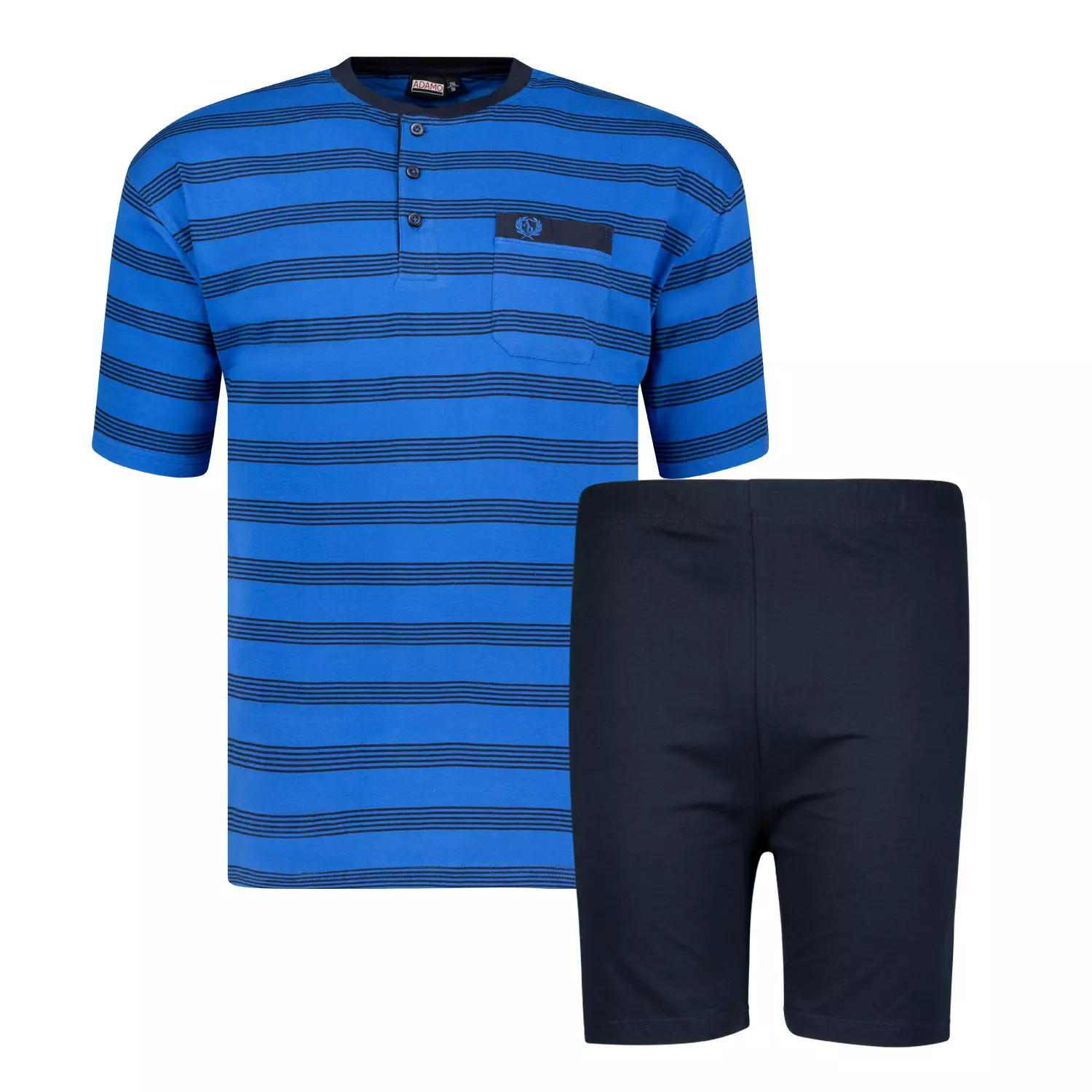 Adamo shorty pyjama blauw. Model Anil, Pyjamabroek donkerblauw met elastische band en het bovenstuk blauw gestreept. De kwaliteit is 100% katoen.