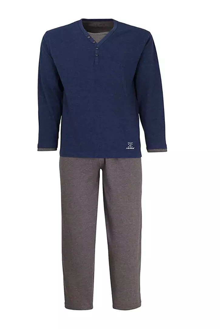 Ceceba pyjama met blauw bovenstuk ronde hals met knoopjes en een uni grijze broek met volledig elastische band. De kwaliteit van deze heren pyjama is 100%katoen en machine wasbaar op 60graden