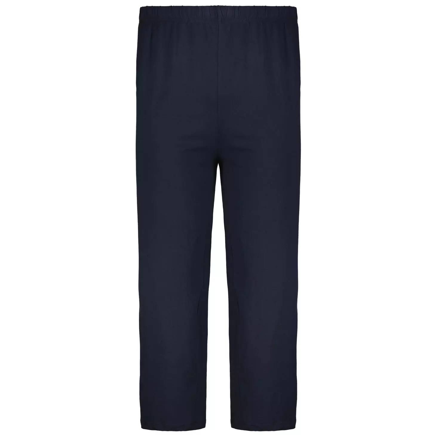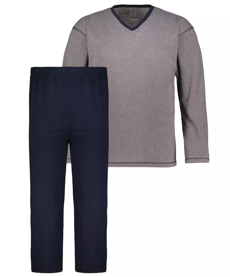 Ceceba pyjama met grijs bovenstuk v-hals en een uni donkerblauwe broek met volledig elastische band. De kwaliteit van deze heren pyjama is 100% katoen en machine wasbaar op 60graden