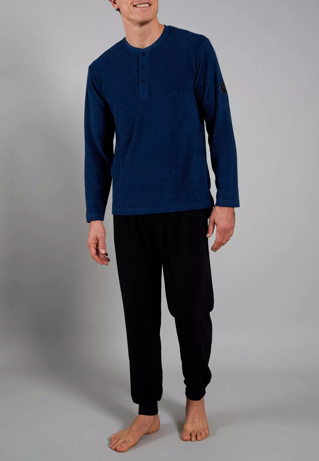 Ceceba pyjama blauw met donkerblauw badstof. Pyjama bovenstuk ronde hals met knoopjes in blauw, Pyjamabroek met aan de onderkant van de pijp een manchet in donkerblauw. De kwaliteit van deze heren pyjama is 80% katoen en 20% polyester strijkvrij. Machine wasbaar op 40graden.