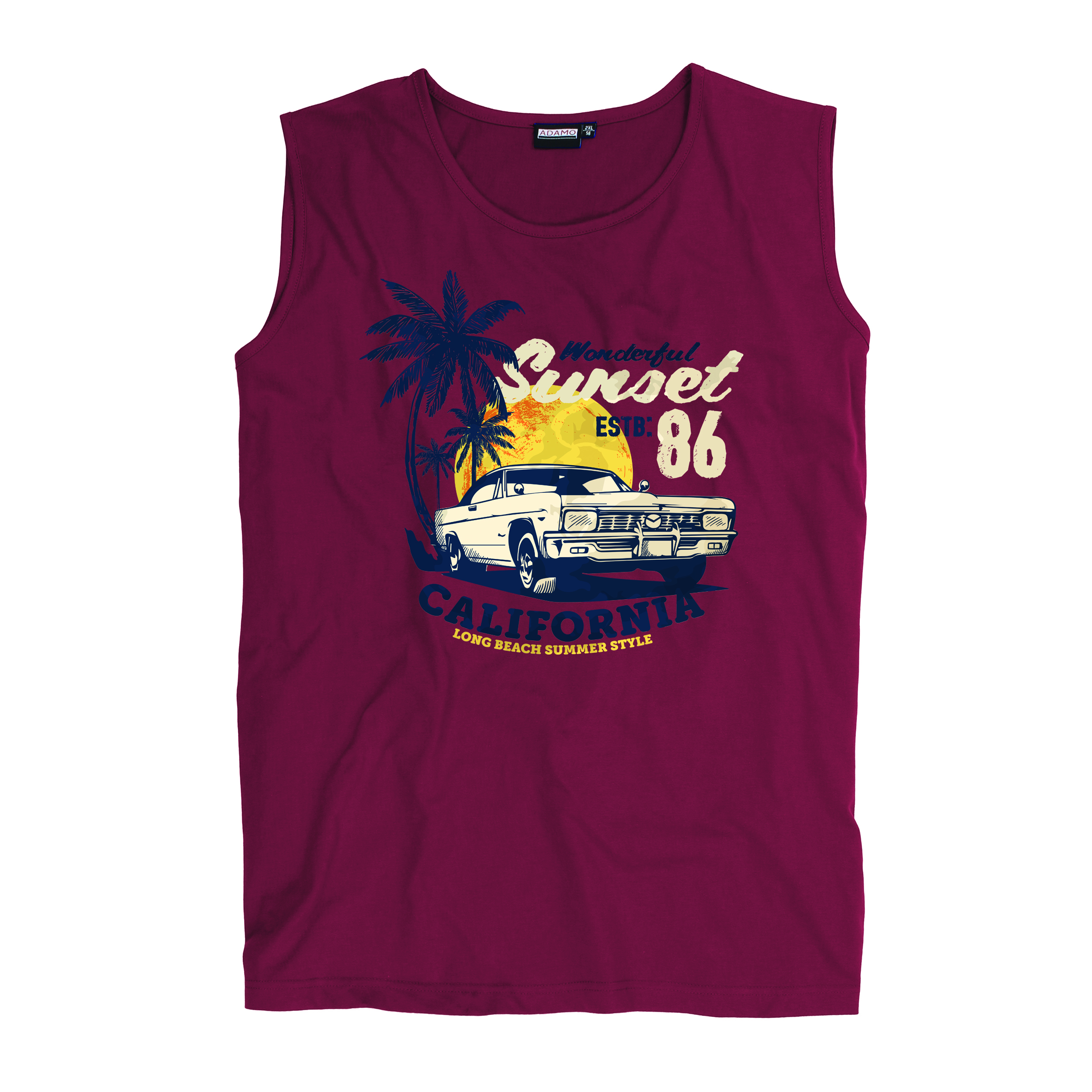 Adamo lang vallend mouwloos t-shirt met wijde hals en armsgaten in rood met California print. De kwaliteit is 100% katoen.