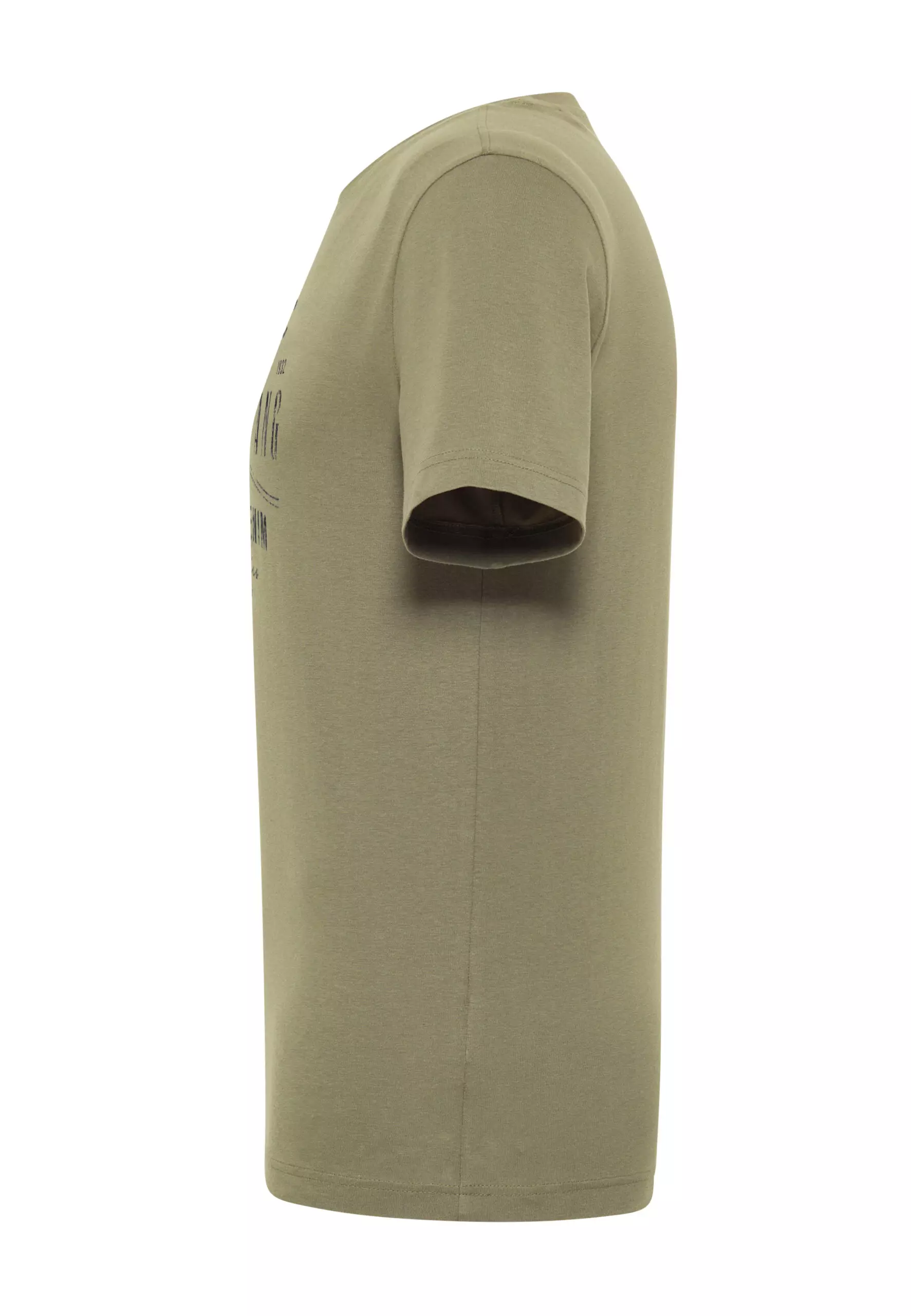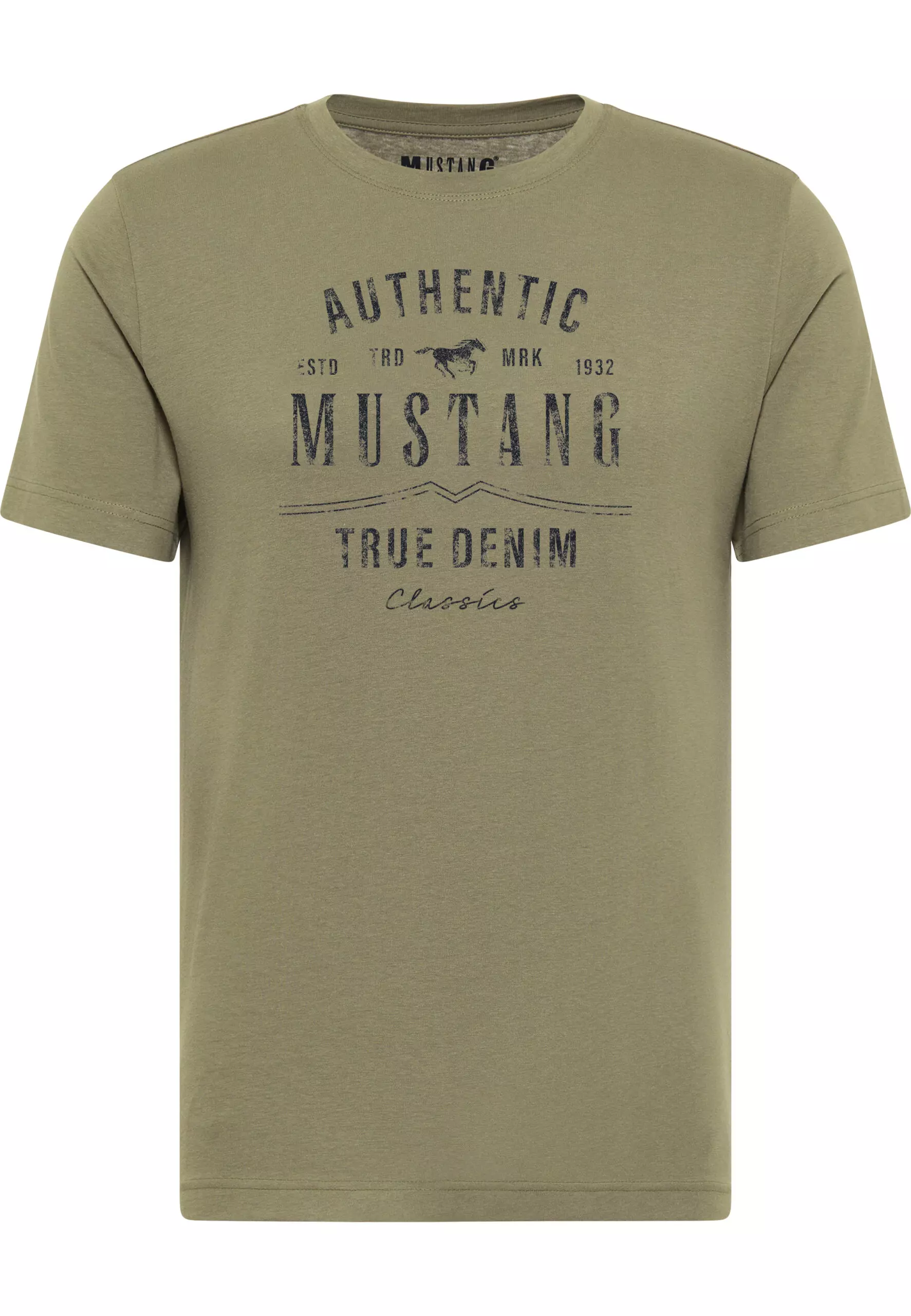 Mustang korte mouw en ronde hals t-shirt olijfgroen met sportieve print in 100% katoen.
