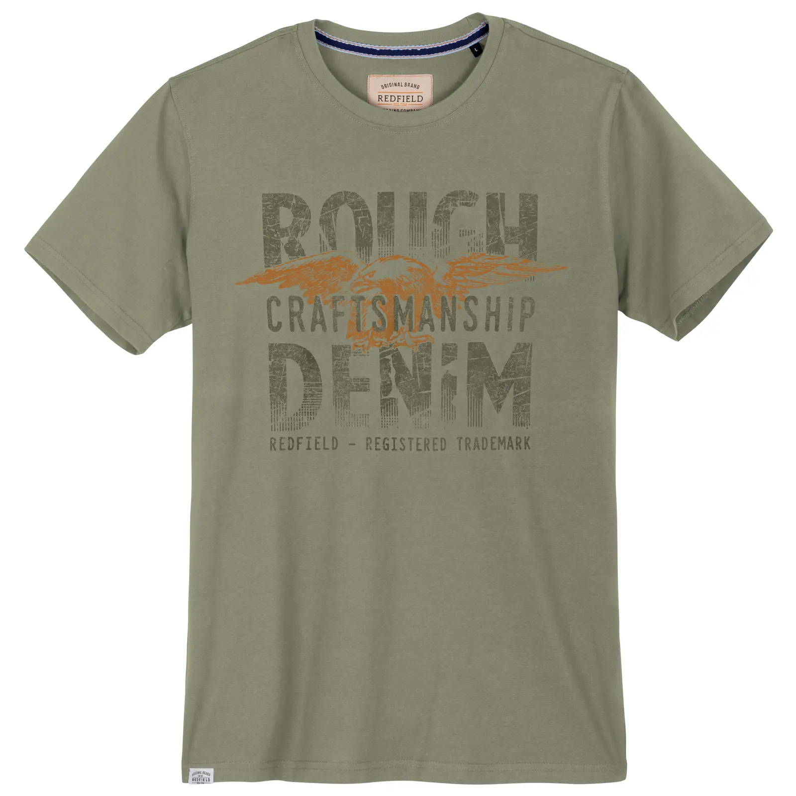 Redfield t-shirt korte mouw en ronde hals in olijfgroen met Rough Denim design. De kwaliteit is 100% katoen.